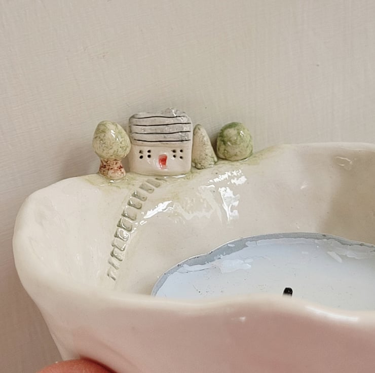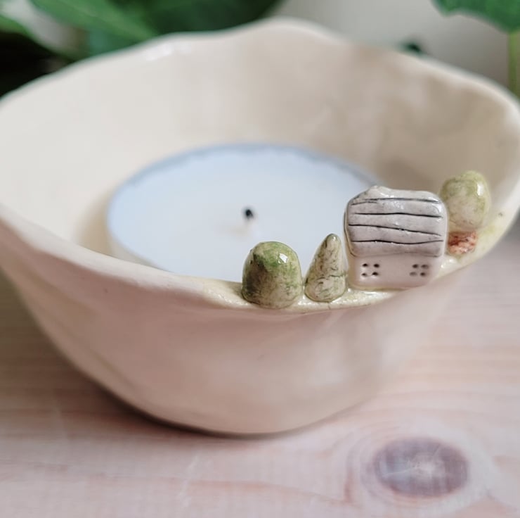 This little pot has a tiny house and trees to sit on the edge and miniature steps pushed into the clay at the side of the pot . Perfect little candle companion.