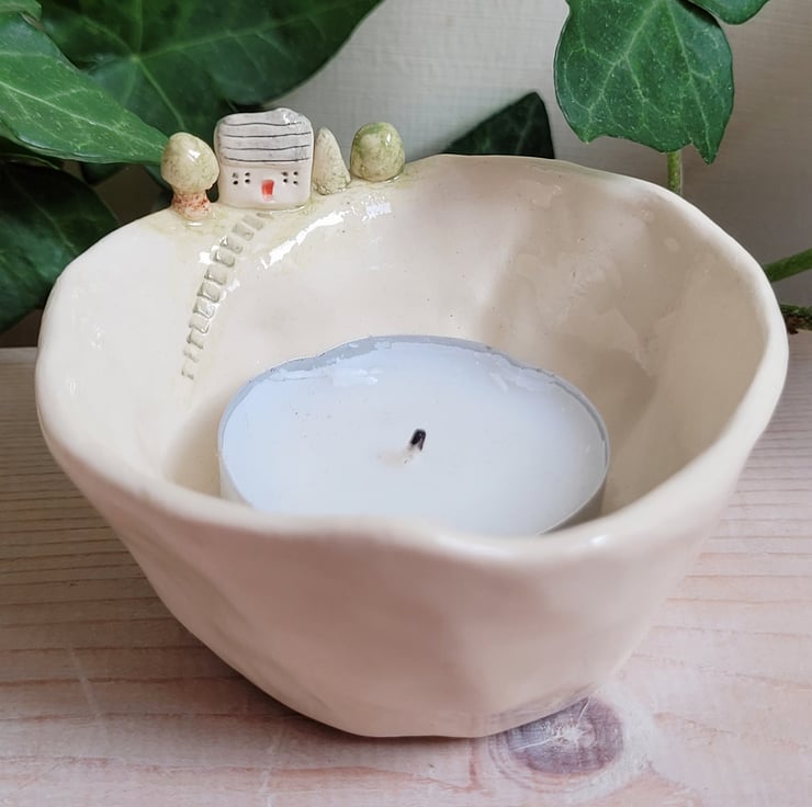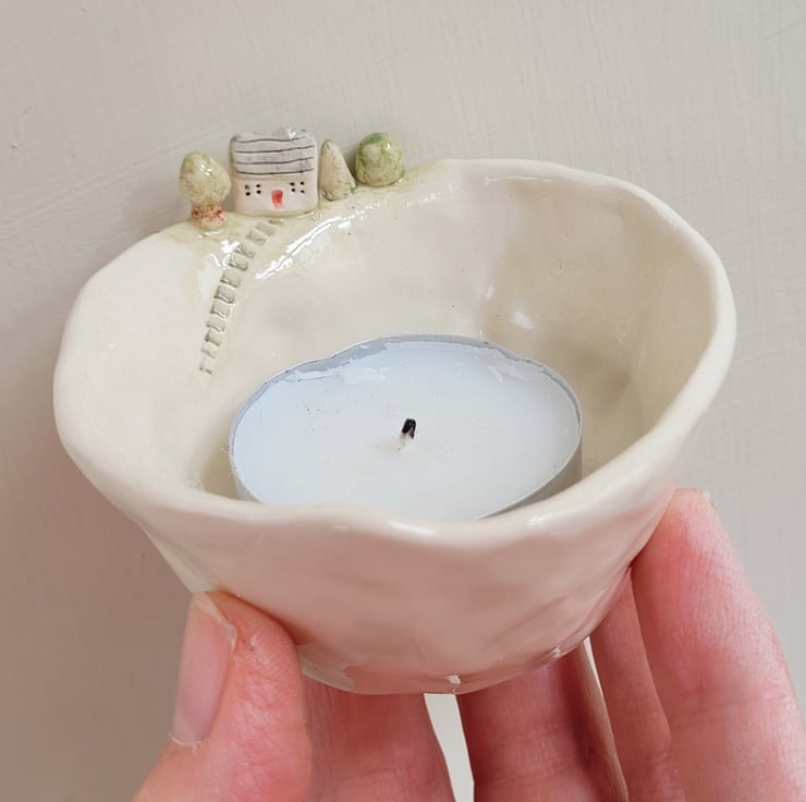 Hand pinched little tealight pot. The house and trees are modelled and attached prior to bisque firing, along with little steps pushed into the clay . The piece is then hand painted, and the whole pot dipped in clear lead-free glaze prior to the final firing
