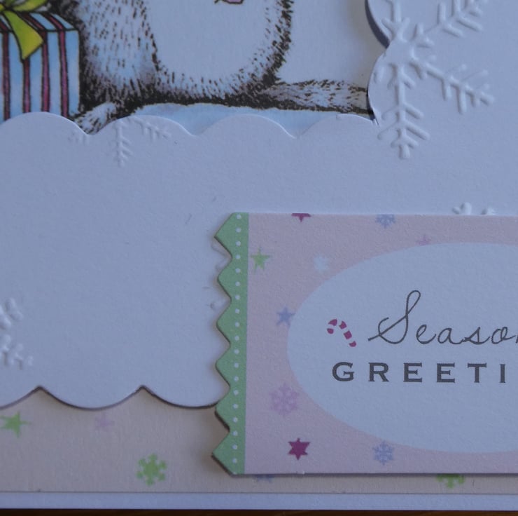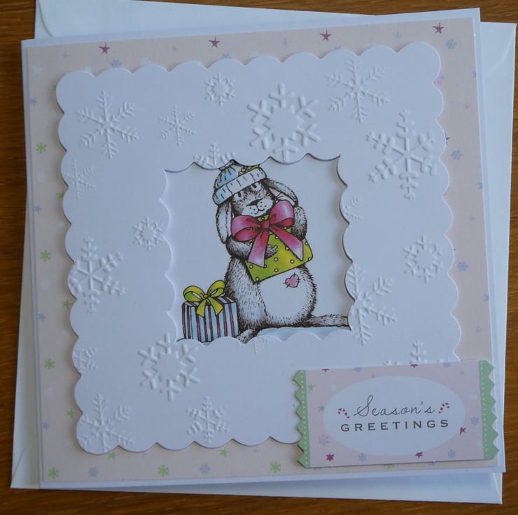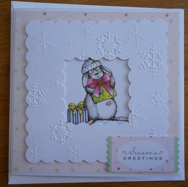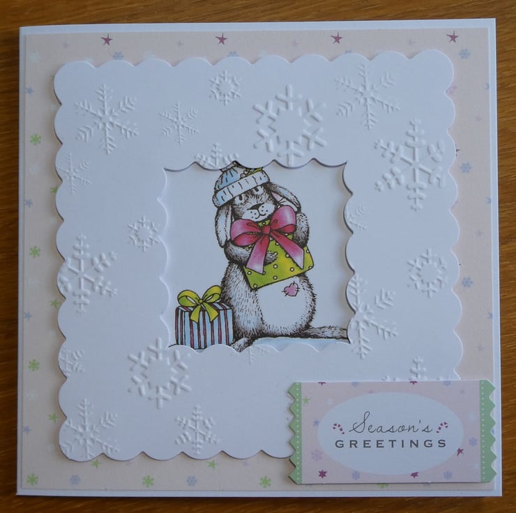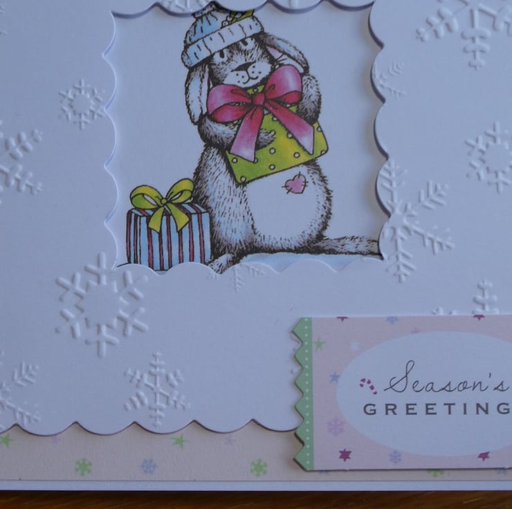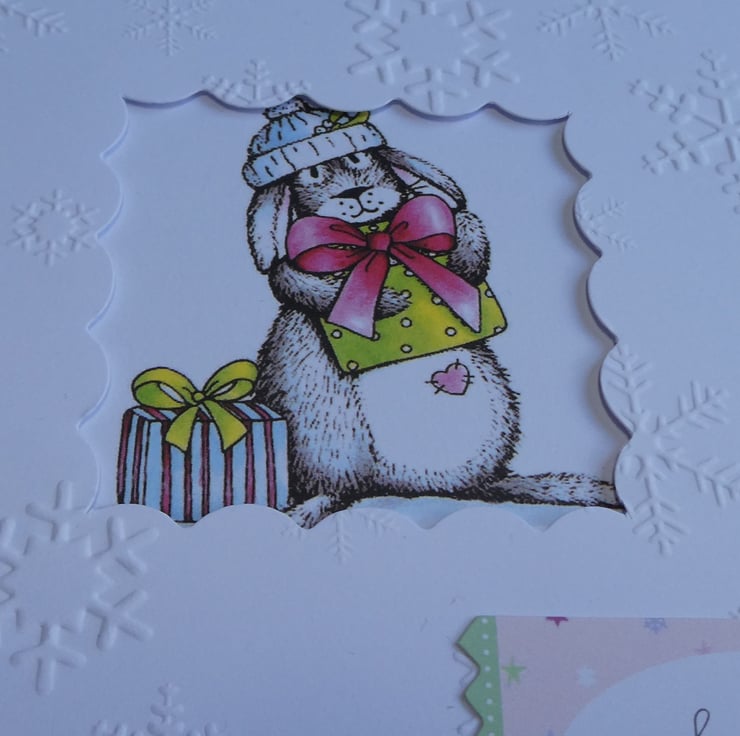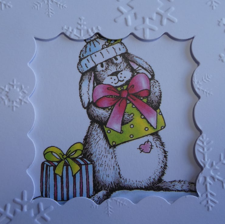 The central printed image shows a grey and white bunny with 2 presents. It has a pink heart on it's tummy and is wearing a blue and white woolly hat. The image has been mounted onto a background of pale pink paper decorated with stars and snowflakes and has been framed with a white scallop edged frame embossed with snowflakes.