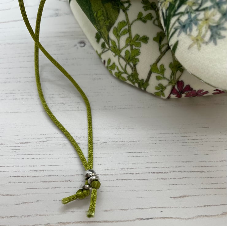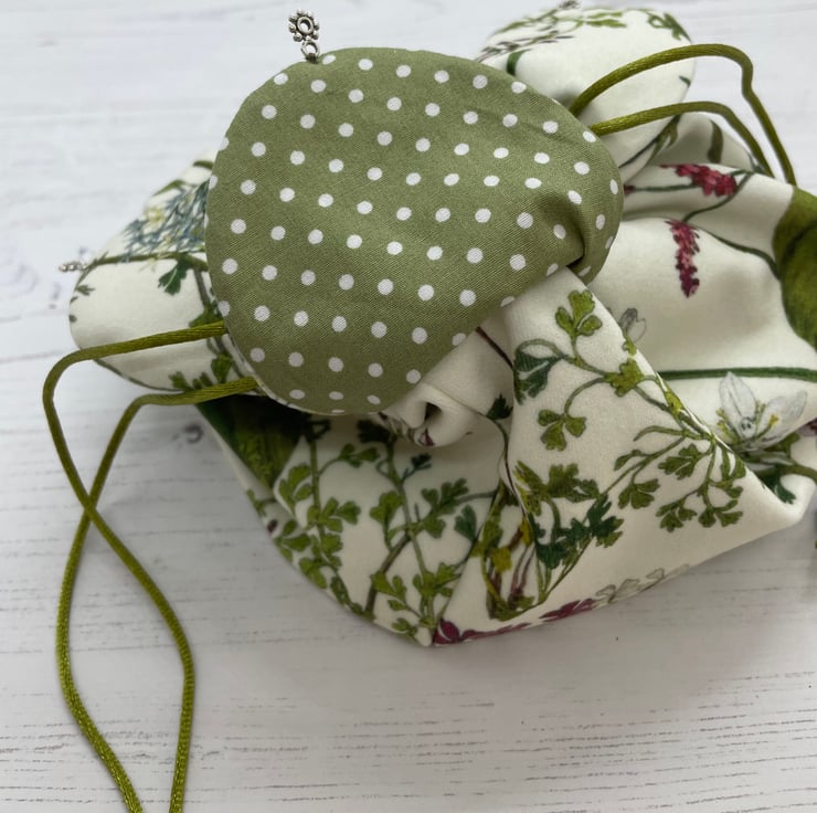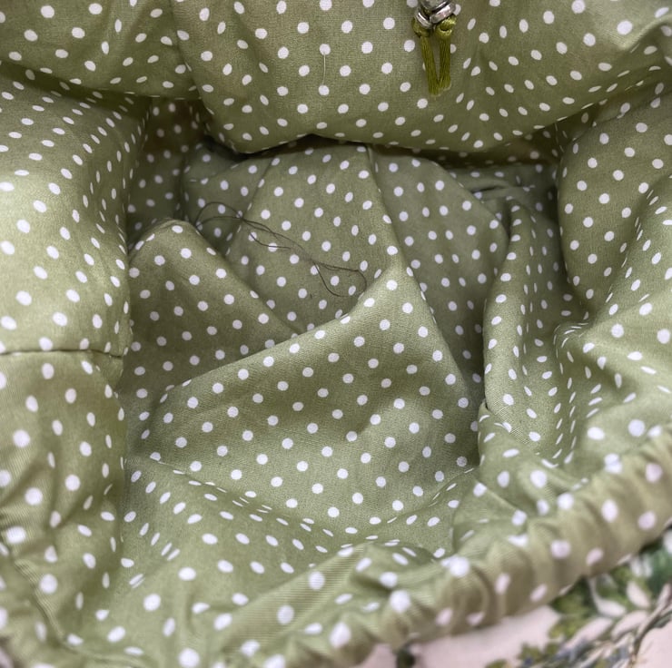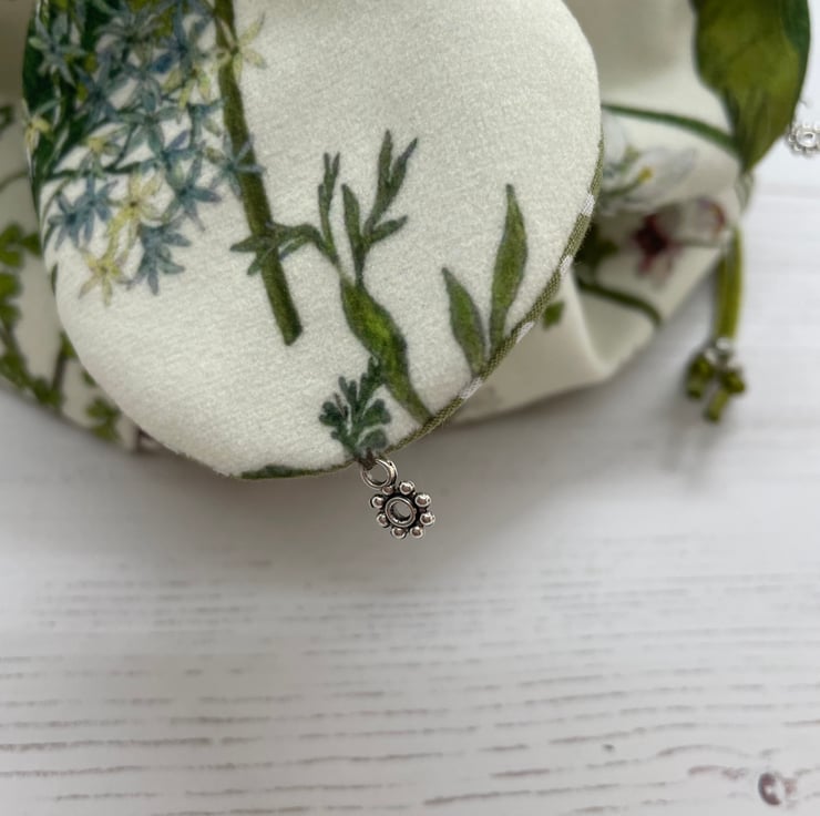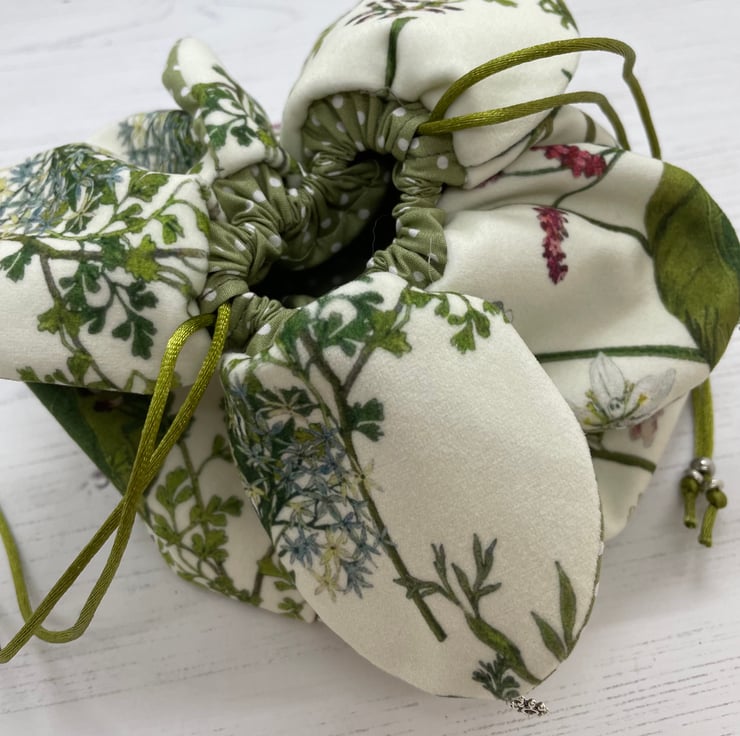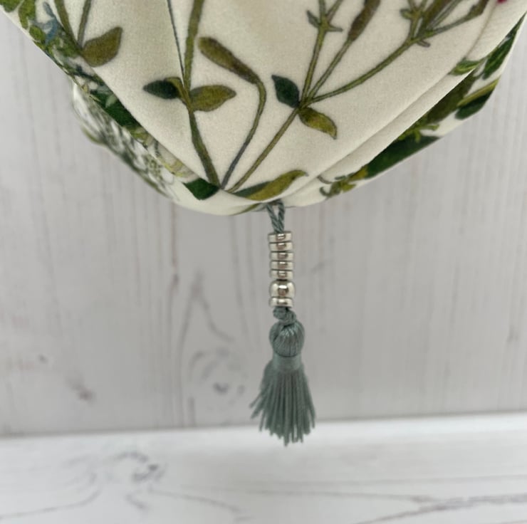With all the elegance of the Victorian Era, this little petal evening bag made of sumptuous botanical velvet, sage polka dot cotton lining. Transitions to the modern day perfectly. Evening at the Proms or picnic at Glyndebourne. Sage green drawstring cord with silver beads at the ends. Each petal has a daisy bead at the top. Green tassel and beads at the centre of the base, which goes into a gentle point.
