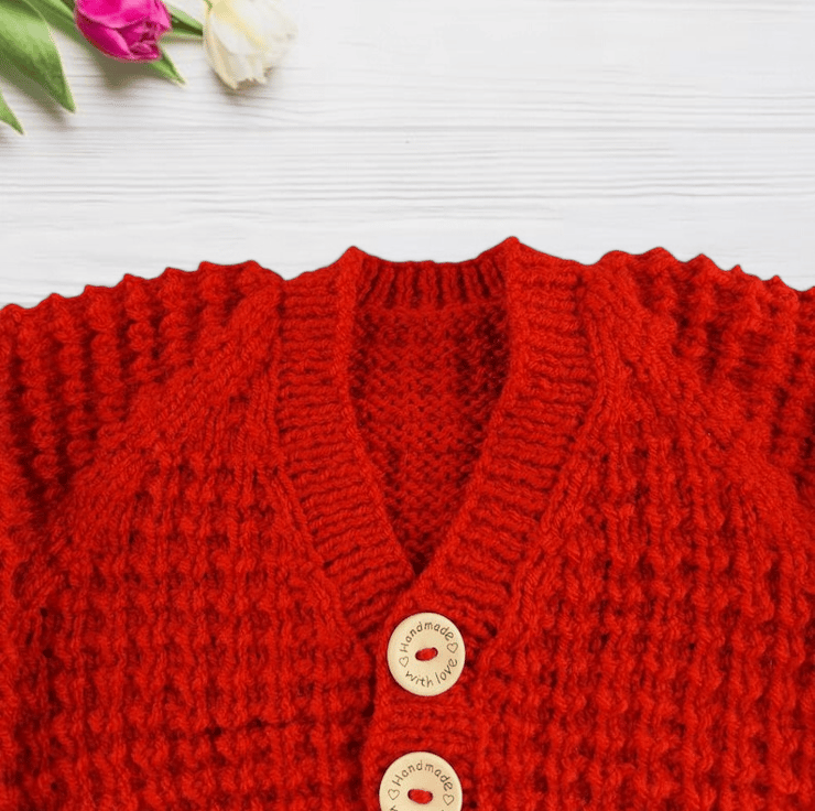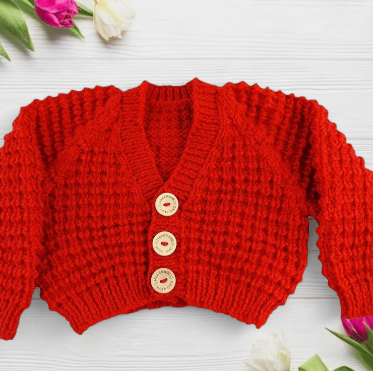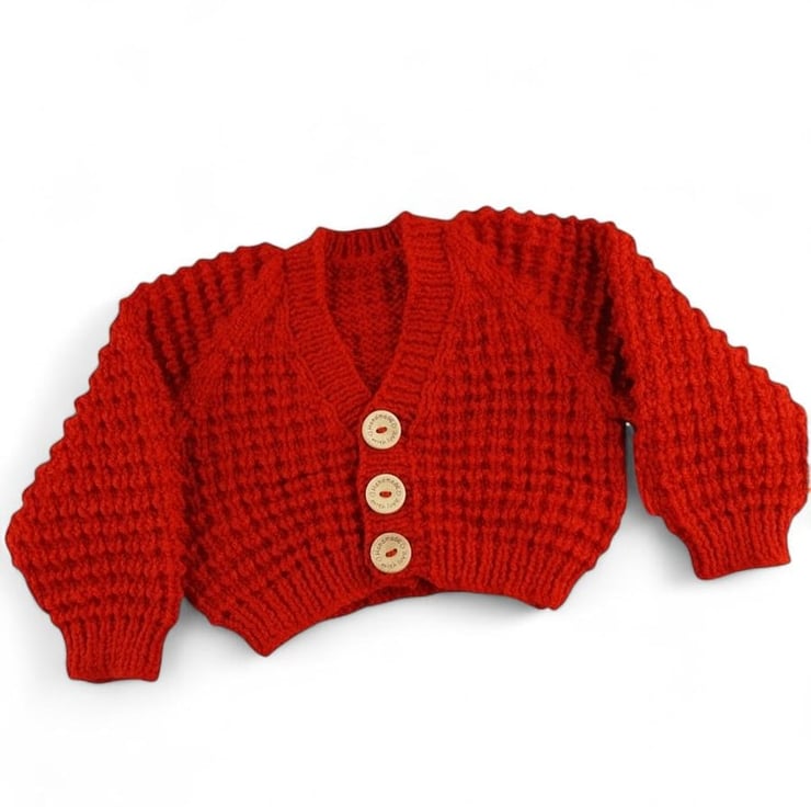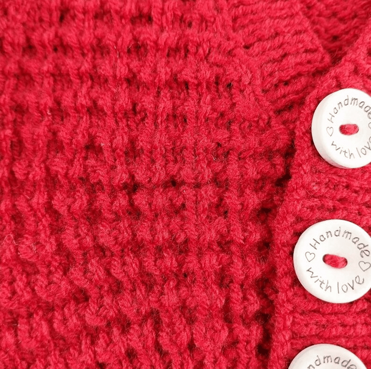 Hand-knitted baby cardigan in a charming fox red yarn. This cosy garment features an all-over textured pattern, adding depth and character to this classic piece. The V neckline and wooden "handmade with love" buttons down the front provide a delightful finishing touch, making this cardigan a charming addition to your baby's wardrobe.