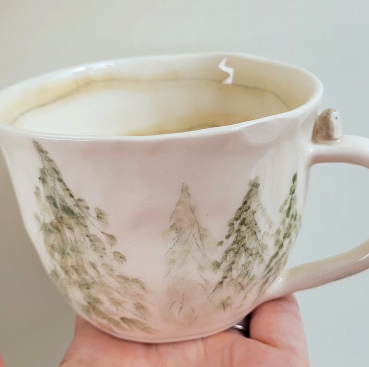 A hand made MADE to ORDER owl cup made by hand pinching. I add a tiny bird, birdprints and handpainted trees. I bisque fire the mug, paint it with trees, stripes and spots with underglaze colours and then clear glaze it. It will then be fired to earthenware temperatures in my kiln.