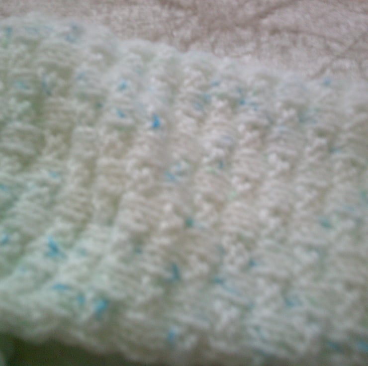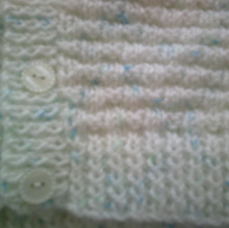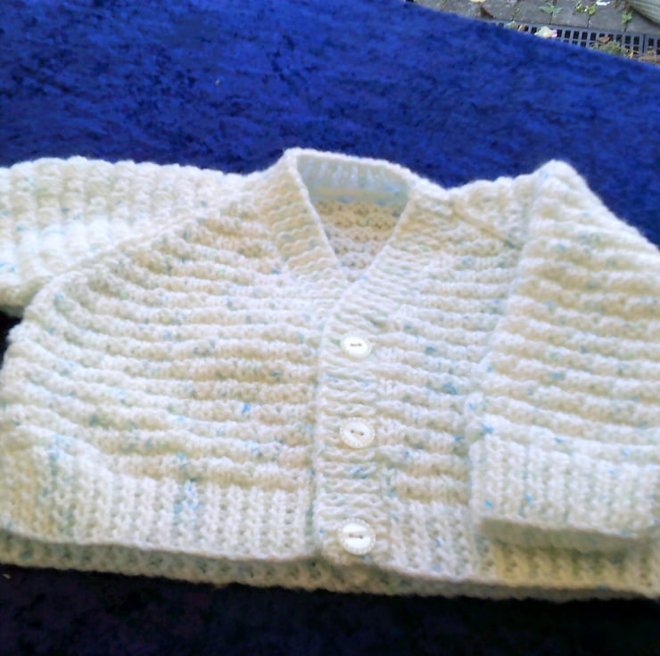 This hand knitted white with pale blue coloured flecks V Neck cardigan would make an ideal addition to a child's wardrobe. The design is of a basket weave with raglan sleeves
