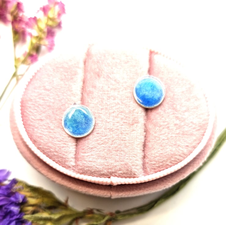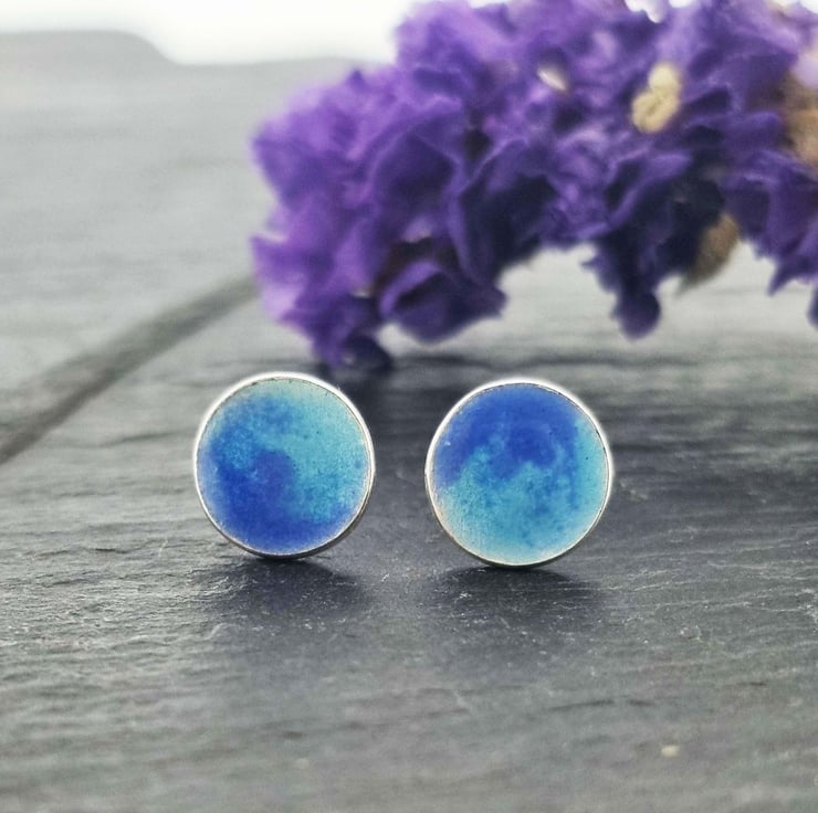 Expertly crafted in solid recycled silver, these exquisite stud earrings are adorned with a captivating blend of light and dark blue enamels. The result is a timeless design that effortlessly combines sophistication with a touch of the sea's tranquil beauty.