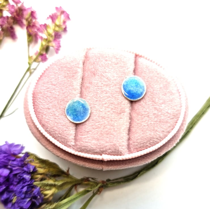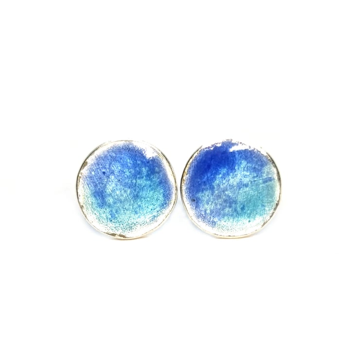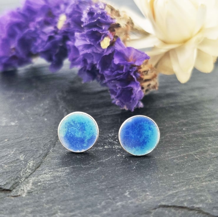 Expertly crafted in solid recycled silver, these exquisite stud earrings are adorned with a captivating blend of light and dark blue enamels. The result is a timeless design that effortlessly combines sophistication with a touch of the sea's tranquil beauty.