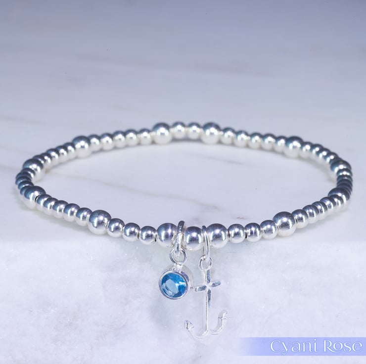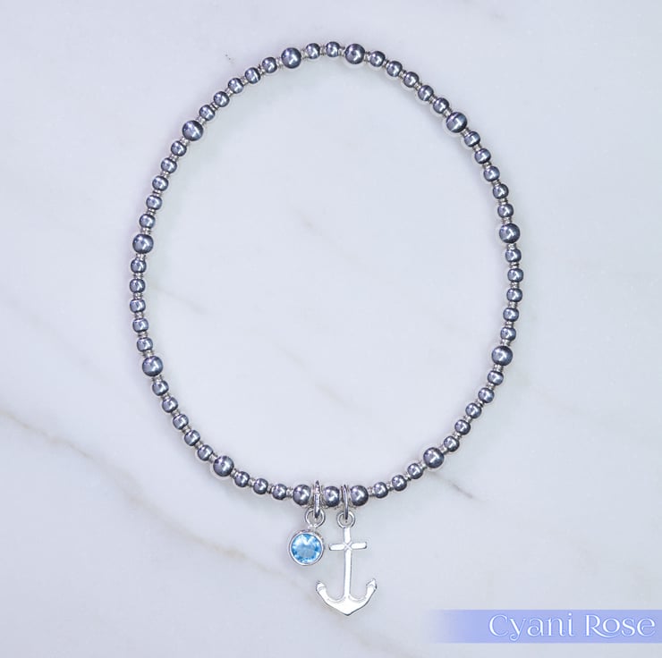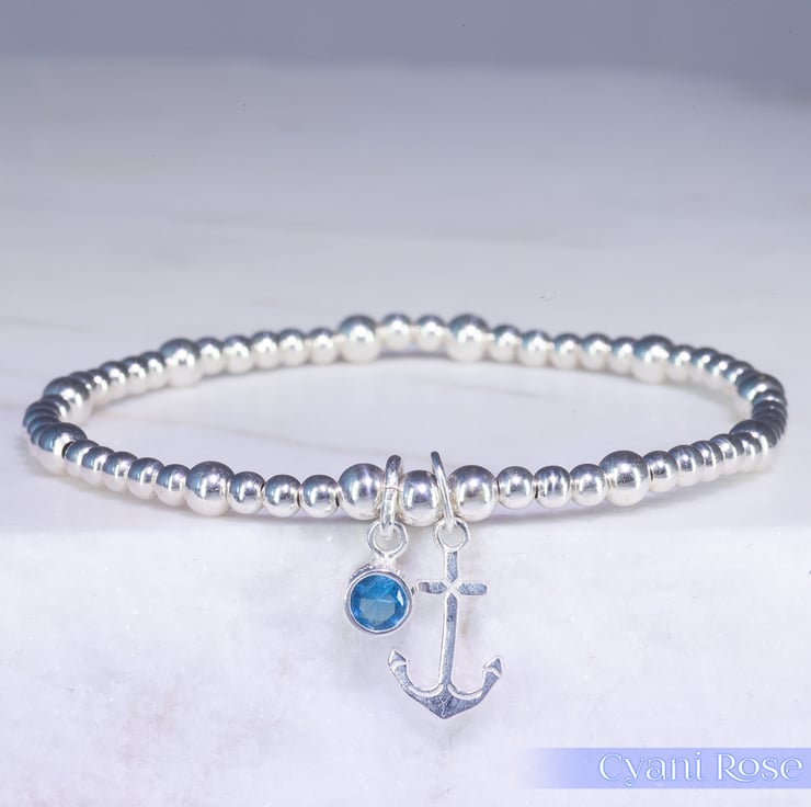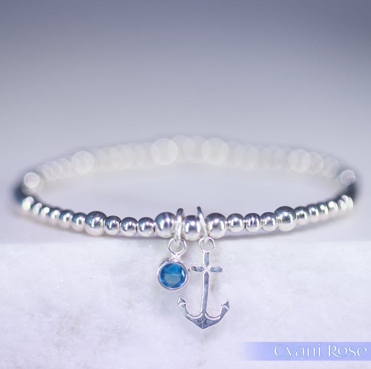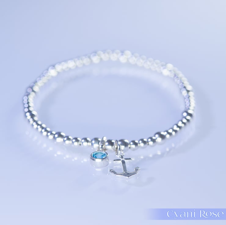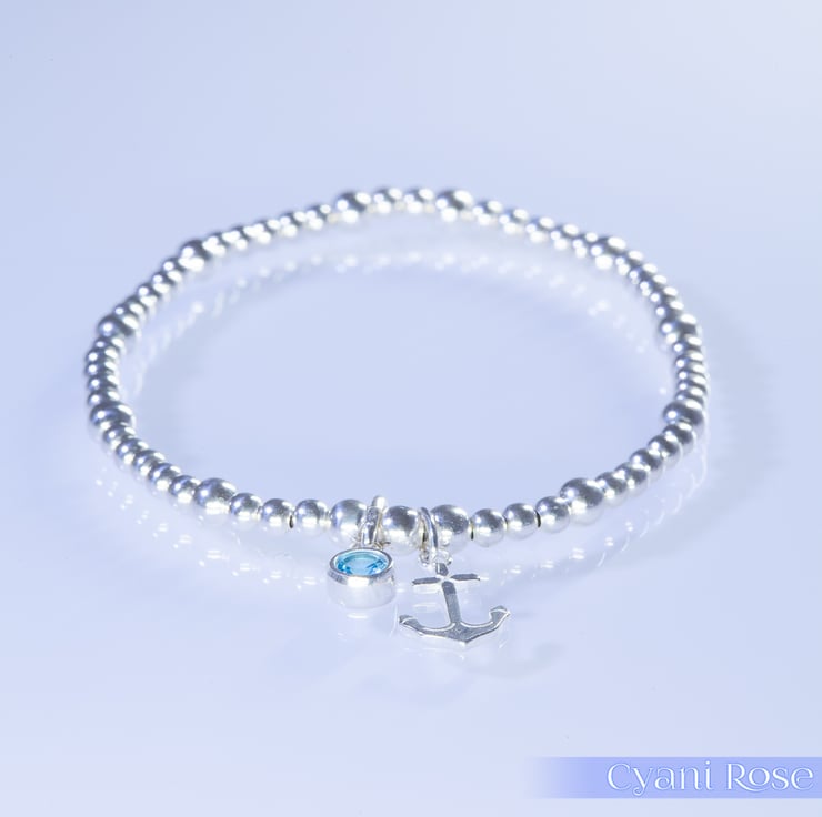 We have made this bracelet using Sterling Silver 3 and 4mm beads, sterling silver anchor charm (approx 1.7cm) and Sterling Silver and Czech Glass charm (approx 1cm).
