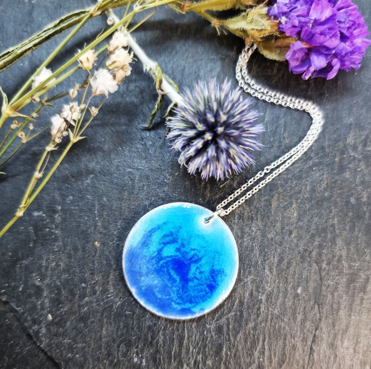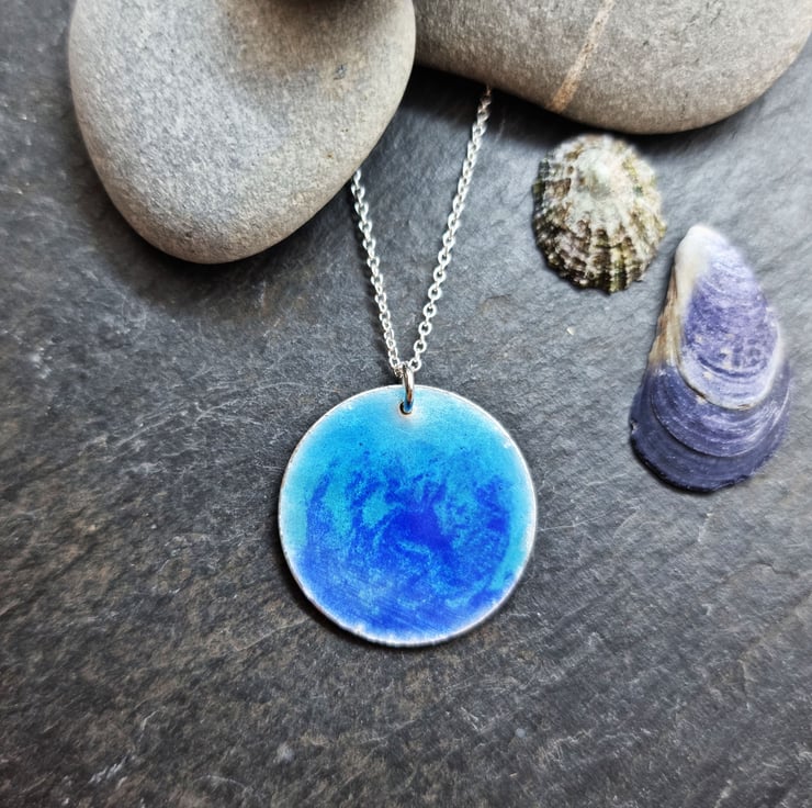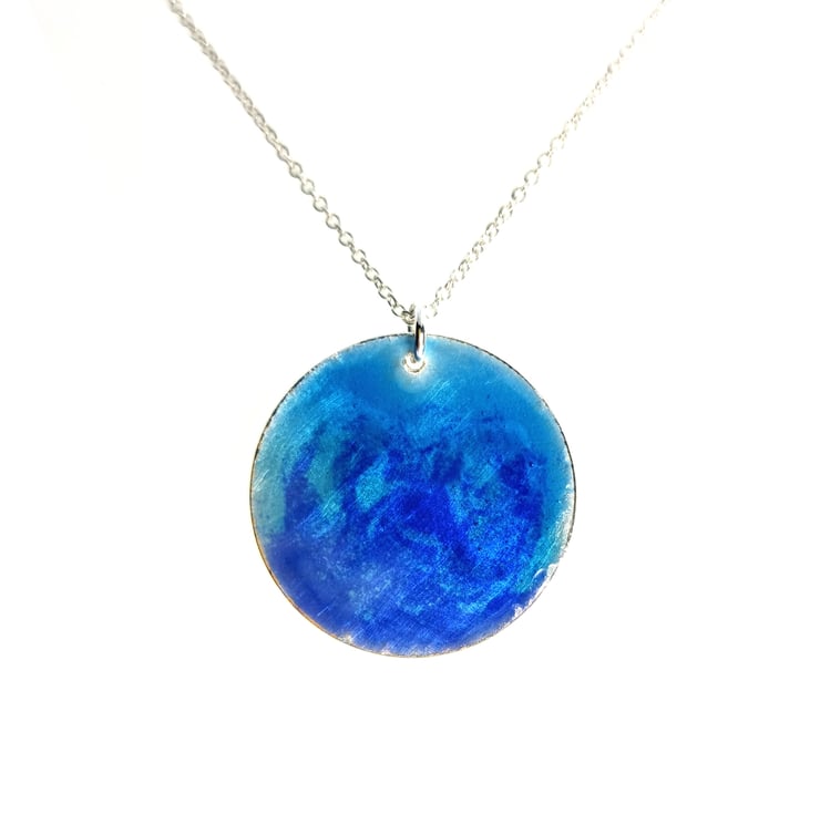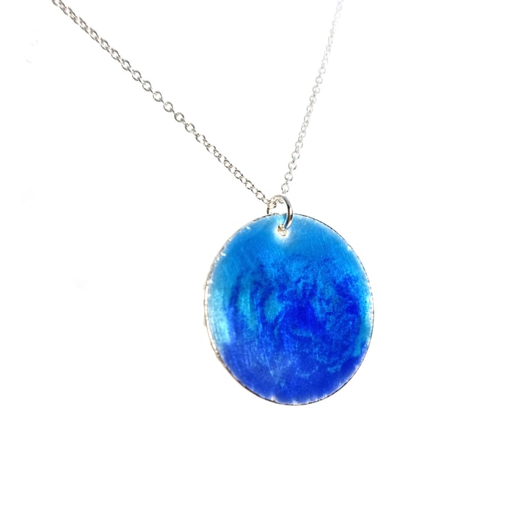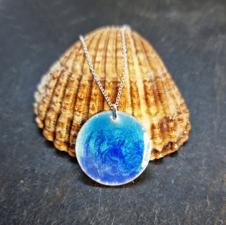 The pendant itself is a work of art, made in recycled silver and adorned with enchanting swirls of turquoise blue and mysterious dark blue enamel. These swirls intertwine to create a mesmerizing pattern that mimics the ever-changing surface of the ocean. Each swirl captures the essence of waves crashing against the shore, making the pendant a true symbol of nature's beauty.