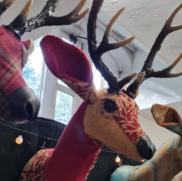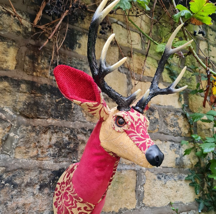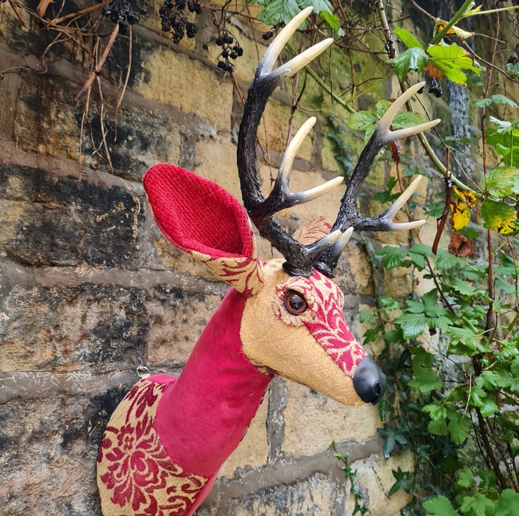 A lifesize faux deer head which I have handmade in tartan rich red and gold brocade abric.He has faux antlers which have been hand textured and sprayed. The head is backed with felt and has a metal hanger to hang it on the wall. It is lightweight.