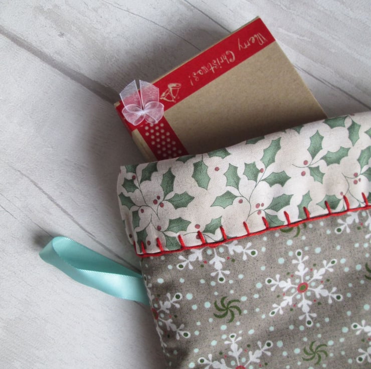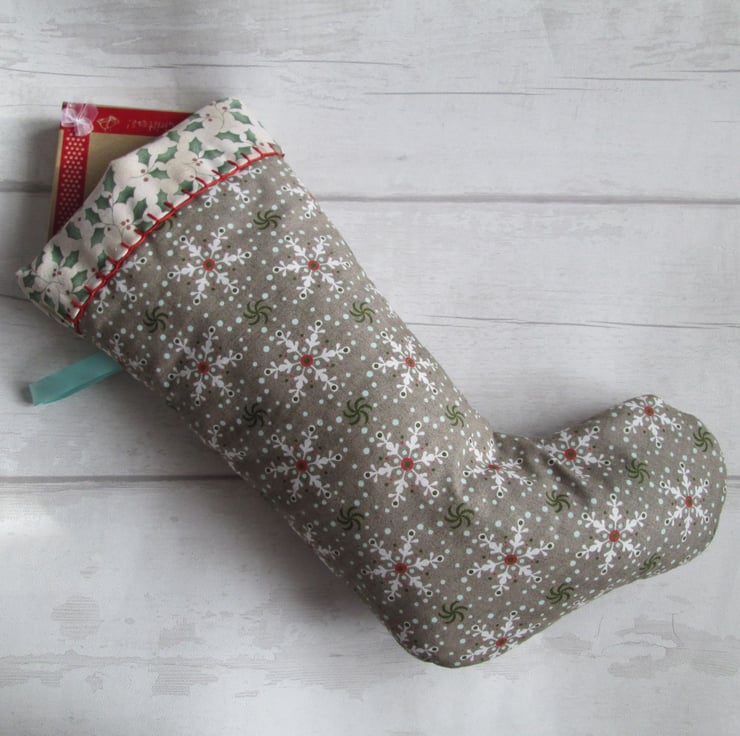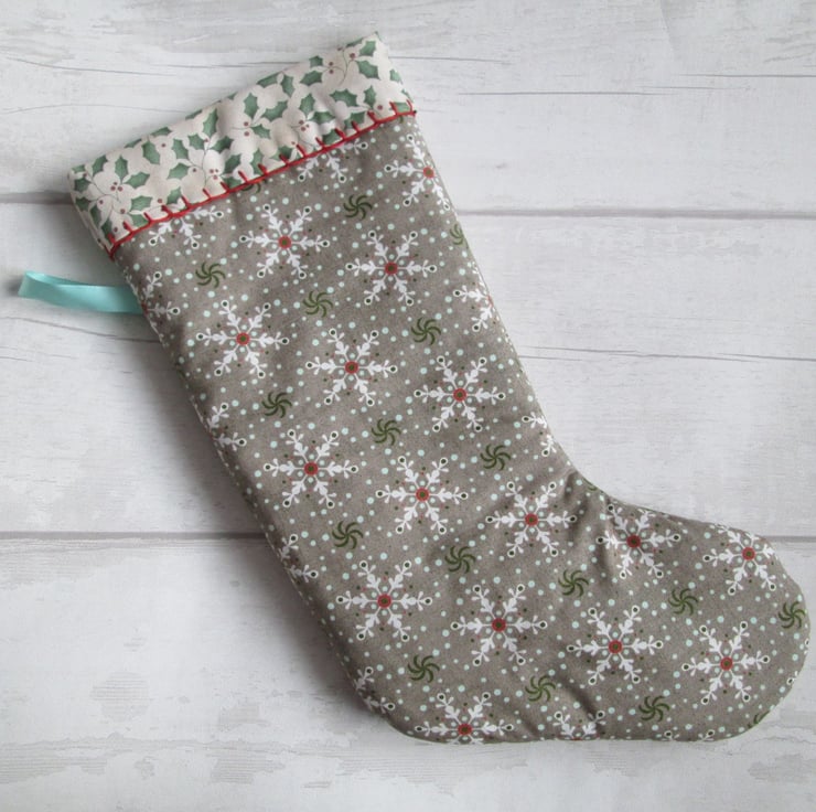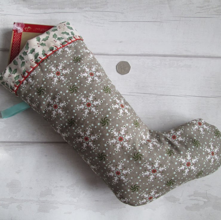 Another Scandi style Christmas stocking in a print of snowflakes on a soft brown background, with a holly print lining and ribbon hanger. The edge of the top cuff had been worked with herringbone stitch in crimson embroidery thread and the whole stocking is lightly wadded.