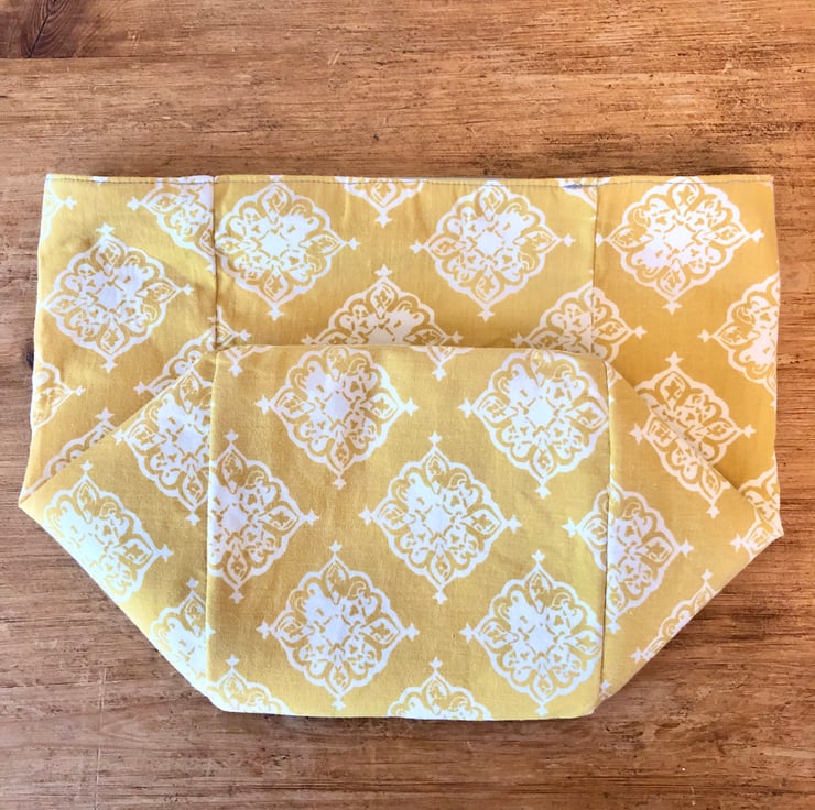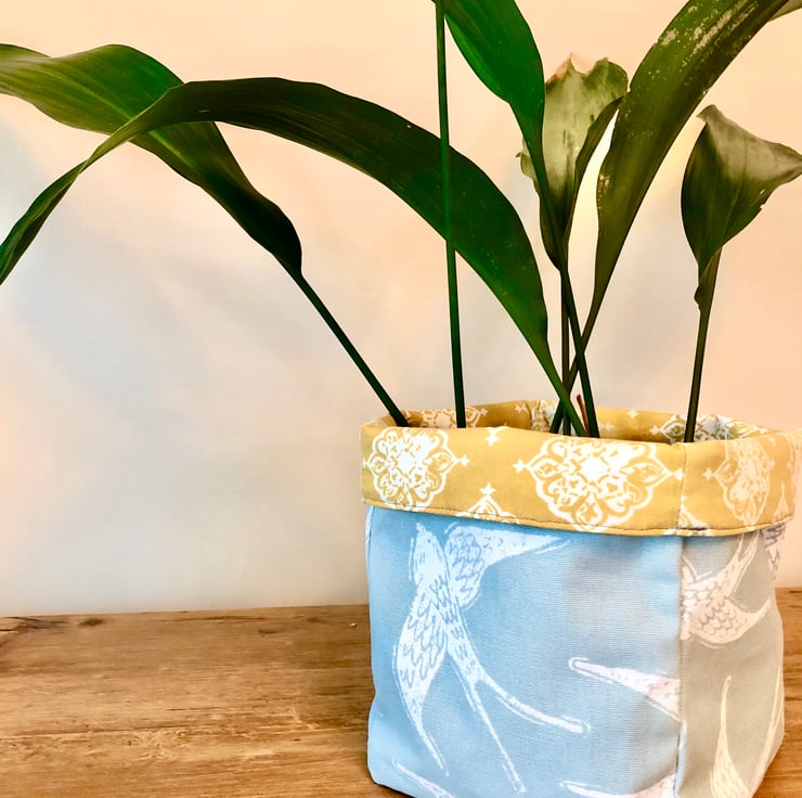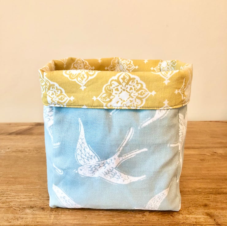 Beautiful swallow print fabric from Studio G with a yellow and white patterned repurposed fabric to line the basket. The basket is reversible and can be displayed with the top rolled over to show the contrasting fabric. It can also be folded flat so it can be easily stored.