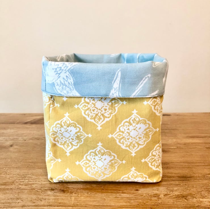 Duck Egg Blue and Yellow Reversible Fabric Storage Basket.