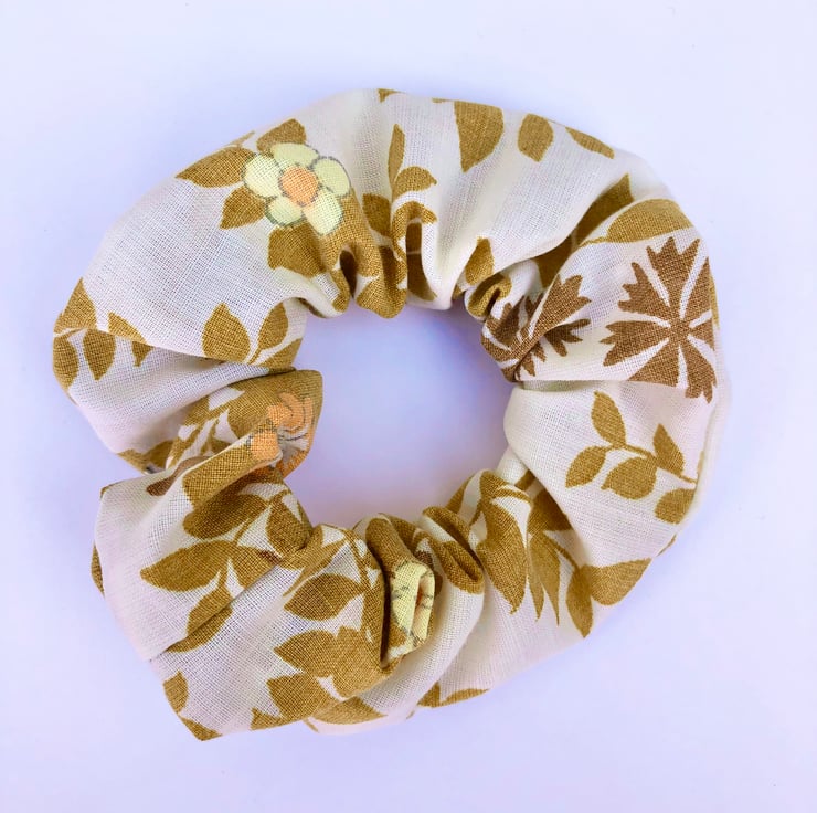A lovely floral and leaf print scrunchie made from up-cycled/repurposed fabric.