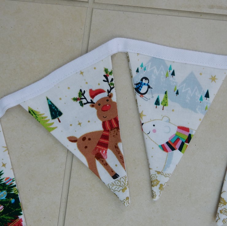 This cream coloured Christmas mini bunting is a little smaller but equally effective. It is made from Christmas themed fabric, pieced with a fabric featuring gold holly leaves. There is a Santa, polar bears, Christmas trees and sleighs. The flags are backed in a combination of the same fabrics, making them double sided which helps them to hang well. The white tape measures 145 cm (55 inches), with the measurement from first to last flag being approx. 103 cm (41 inches). This gives a generous length of bunting, with ties at each end for hanging. Each of the 11 flags is 11cm (4 inches) deep.