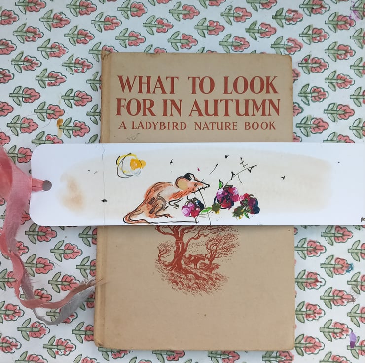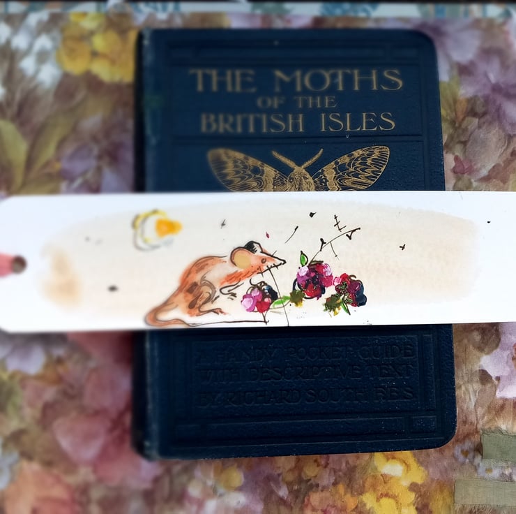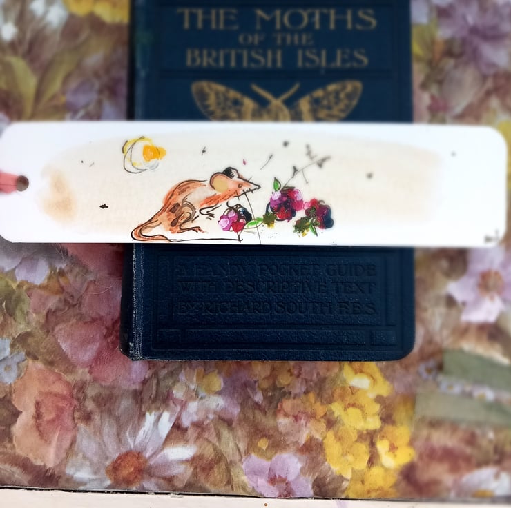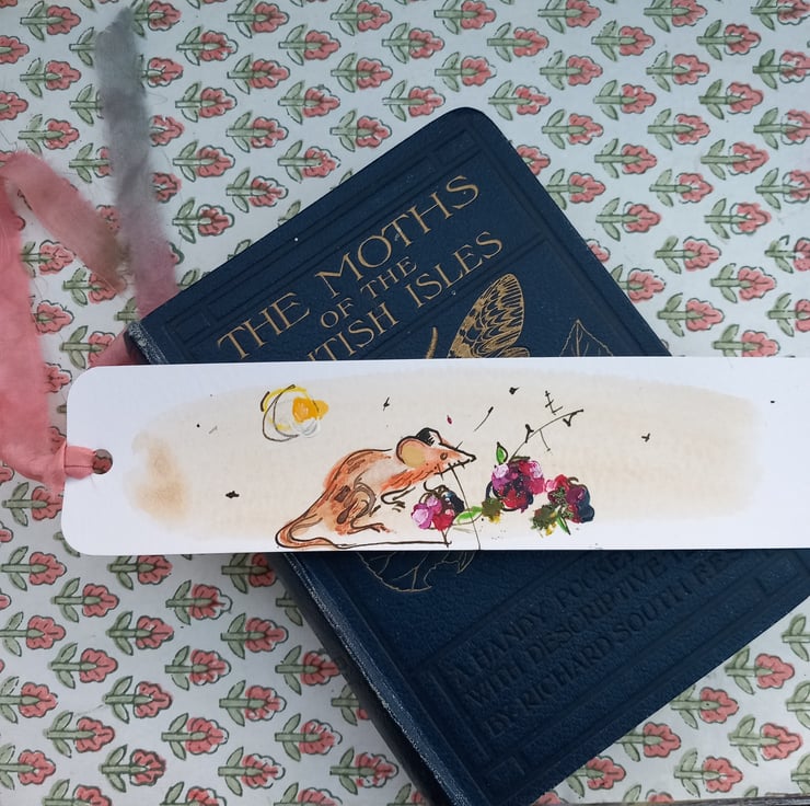 These are all individual. Hand drawn in Indian ink and painted with watercolours. So mini works of art. A simple gift to pop in a card or write a message on the back. With silk trim at the top. I also do personslised ones if you wish to have a name on them . X a gift for a nature and book lover x small gift to sit along side your favourite book. Comes thoughtfully wrapped. This clever mouse has been blackberry picking under a full.moon.