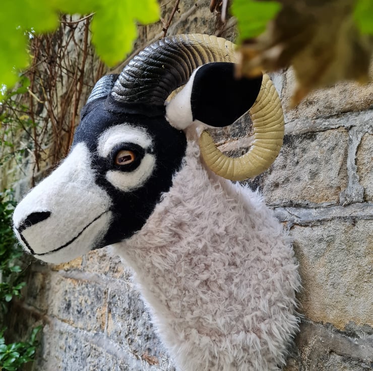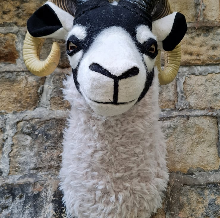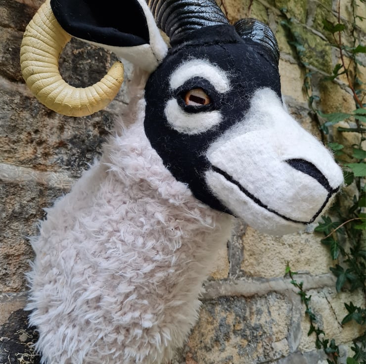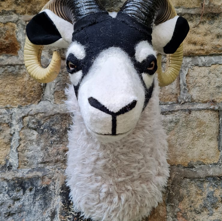 A lifesize faux swaledale sheep head which I have cast myself and covered in hand stitched faux sheepskin and black/cream vintage wool fabric.