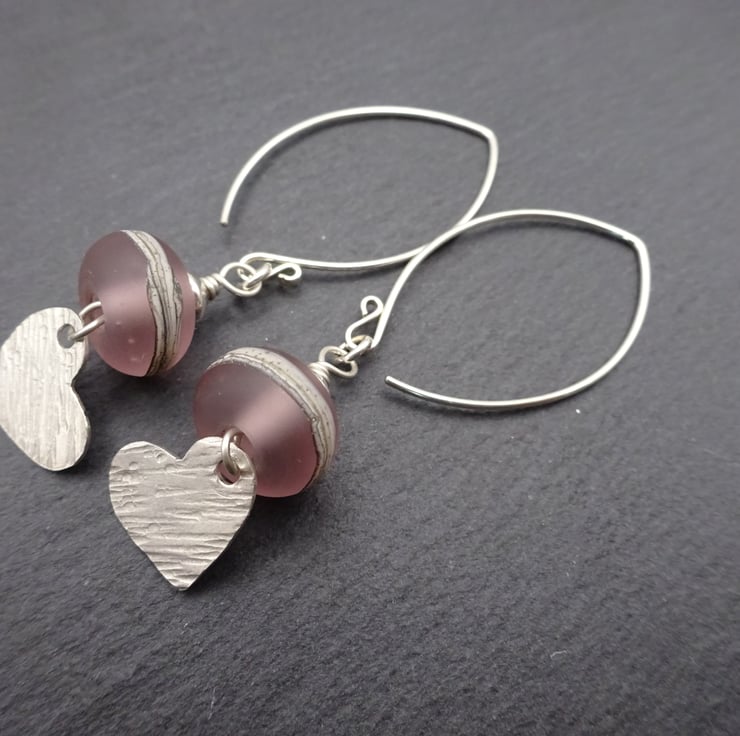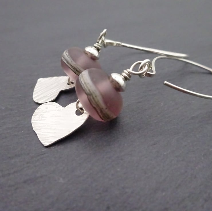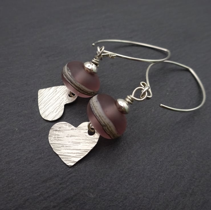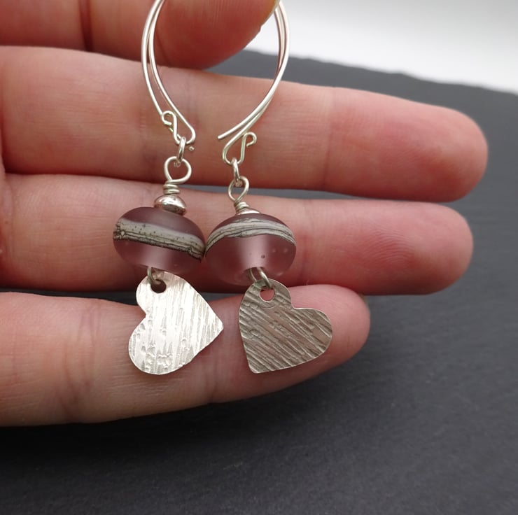 A pair of earrings made with handmade sterling silver ear wires, handmade lampwork glass beads and handmade sterling silver hammered heart charms.