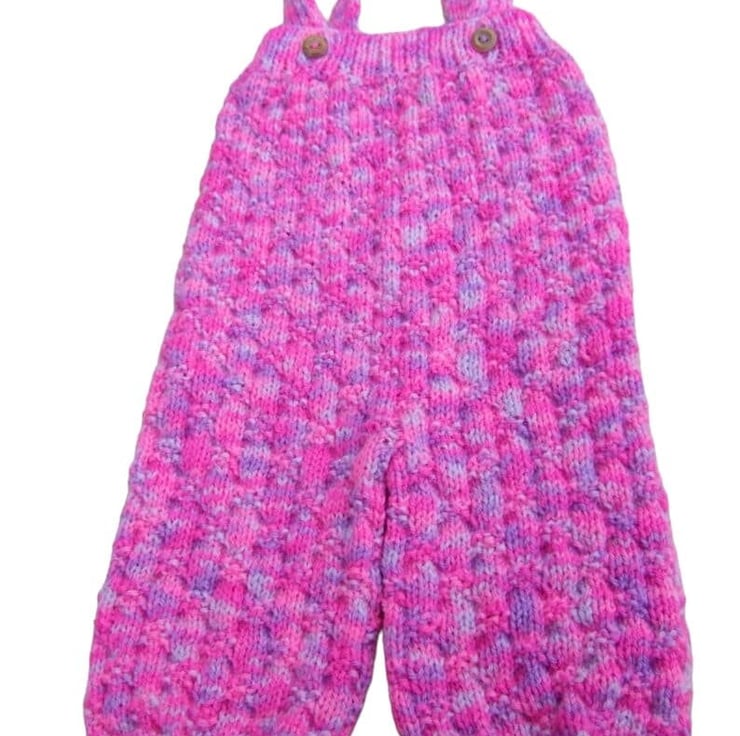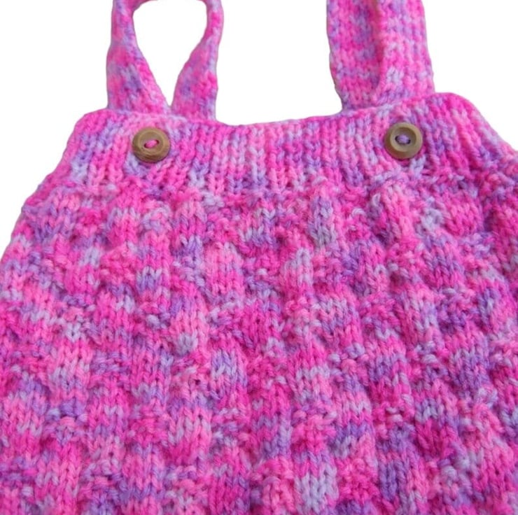 The dungarees boast a lovely mix of pinks and purples, adorned with two wooden buttons securing the shoulder straps for easy dressing and undressing.