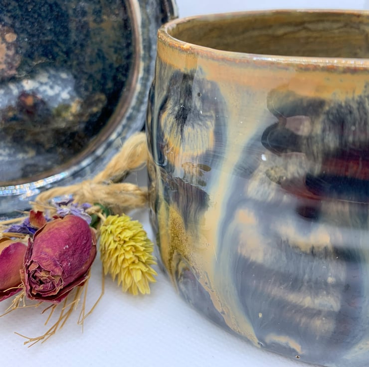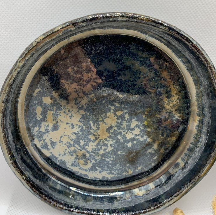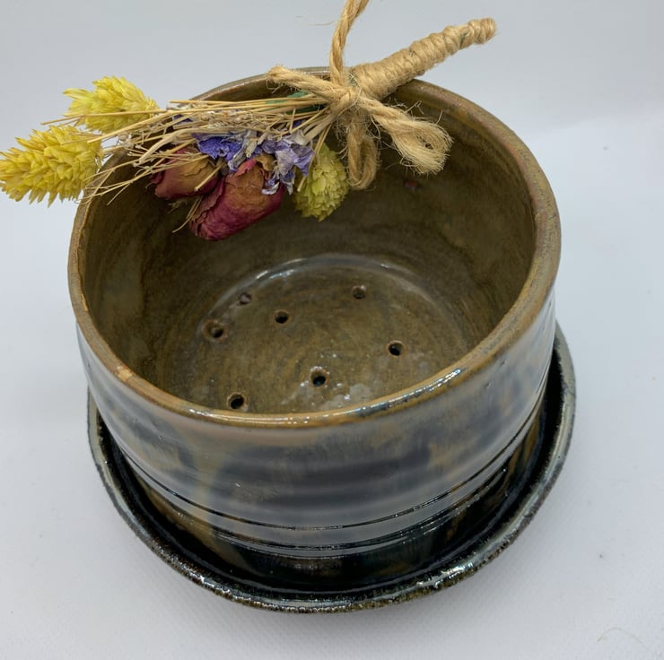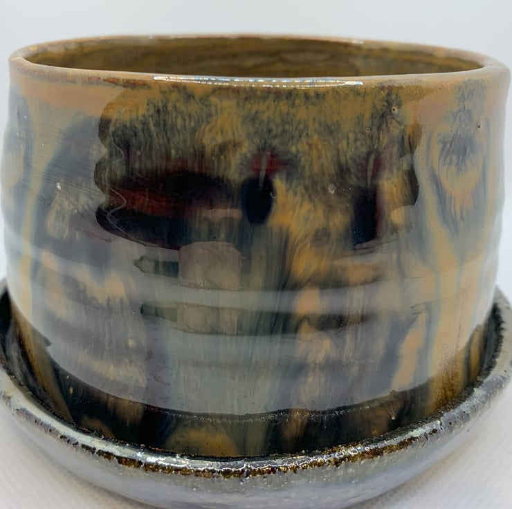 A plantpot with saucer to catch any moisture as the pot has drainage holes. The glaze has produced a random design which is very effective and has an autumnal feel about it. The width is 4.5ins(11cms) and its 3ins deep (7cms). The saucers width is 5ins (12cms).