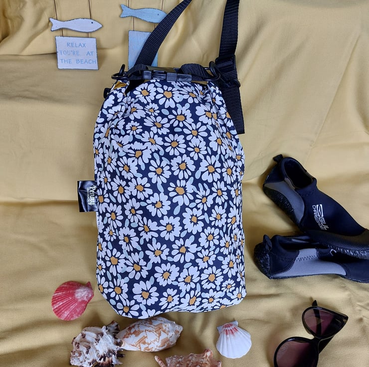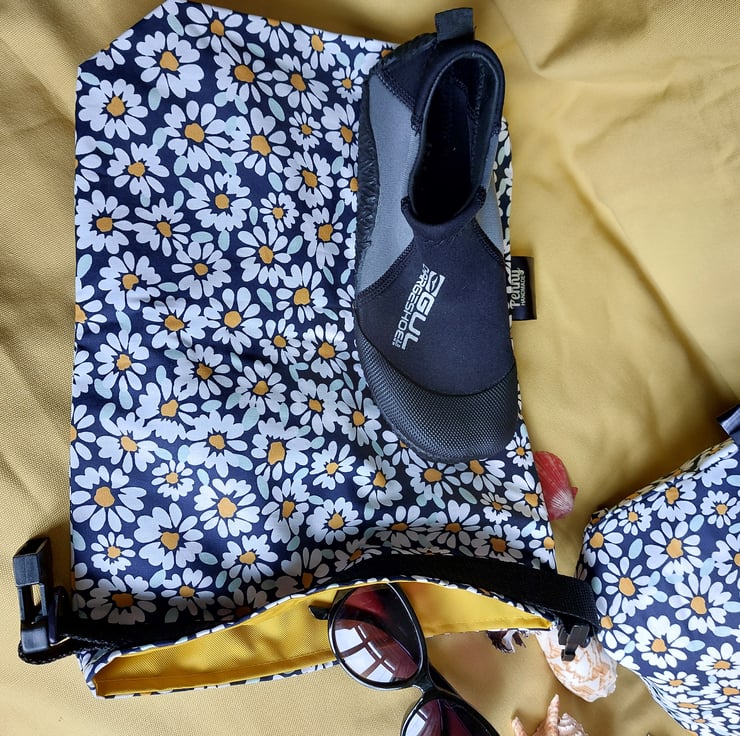 Cross body drybag/wetbag Handmade using a coated cotton fabric outer with daisy flower design. Item is lined with a mustard rubberised waterproof fabric including a handle inside to assist hanging out to dry after use. Drybag measures 35cm in length and is 27cm wide, depth of boxed corners is 9cm. Item has a roll top using webbing and is secured using the attached clip. Strap is removable and can be adjusted for either cross body or shoulder carrying. This item is waterproof and has a wipe clean outer. Coated cotton fabric is certified with an Oeko-Tex Standard 100 Product class I