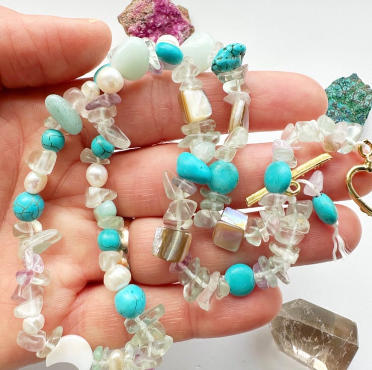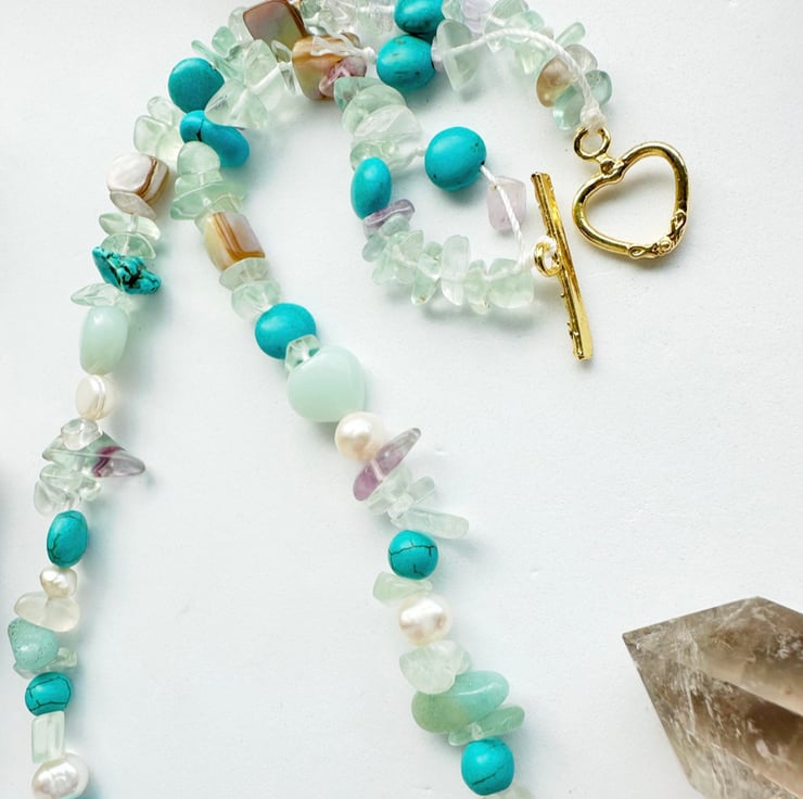 Delicate Handmade 16 inch Freshwater Pearl Crystal Beads with Shell moon, Fluorite, Larimar, Turquoise Magnesite, Amazonite Hearts and a Gold plated heart clasp.