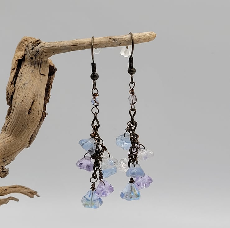 The light of the blue hour is magical. As the night fades in the hour before dawn, cool blue light colours the early morning. I used Czech glass flowers tumbling down a central chain to echo the way that blue light colours the frost of an icy dawn.