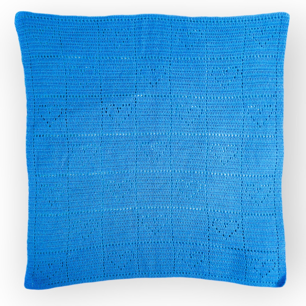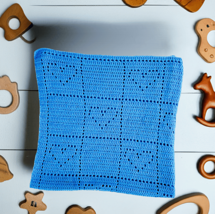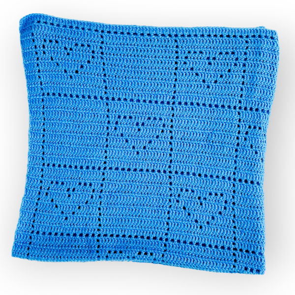 The blanket features a simple fillet square pattern, alternating between charming hearts and plain squares.