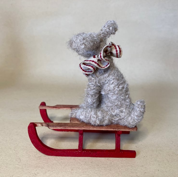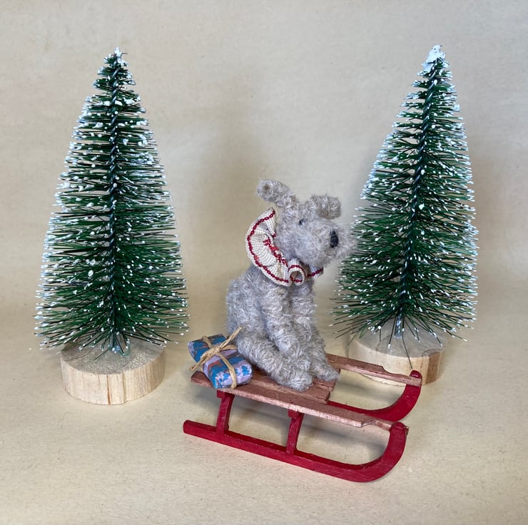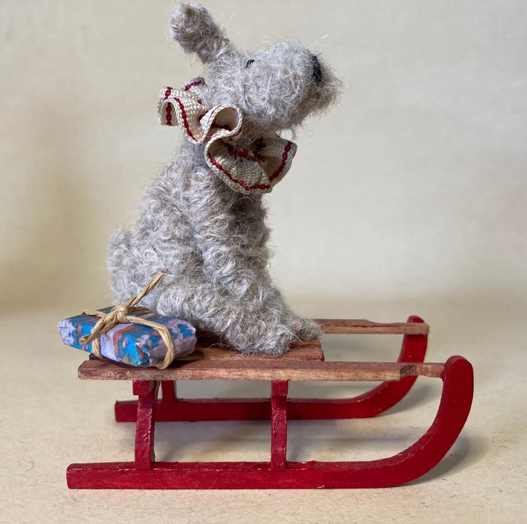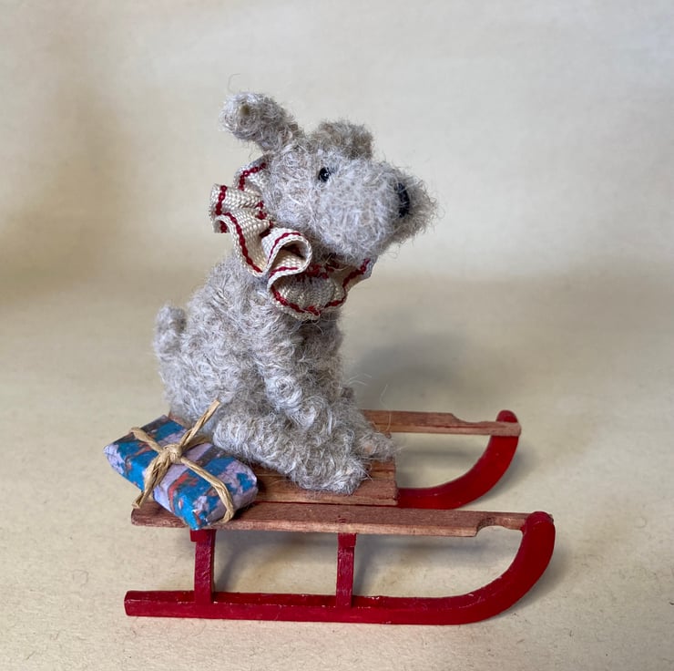 Handmade Christmas terrier on a hand painted wooden sledge with a tiny Christmas present.