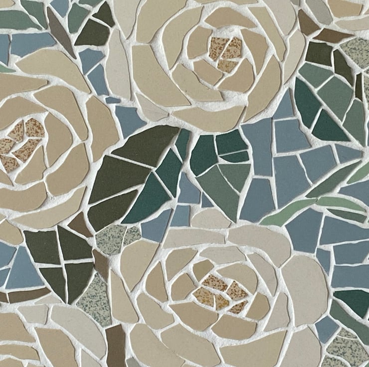A unique, ceramic mosaic wall plaque, hand cut from beautiful Winckelmans tiles. Featuring a delicate Camellia design in matt, muted tones. This artwork is mounted on a wooden canvas and is complete with hanging wire.