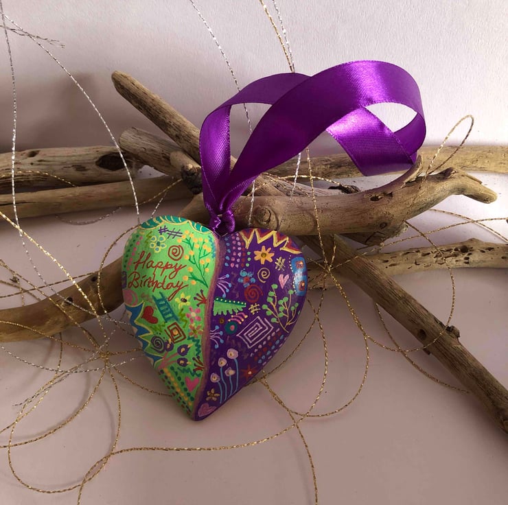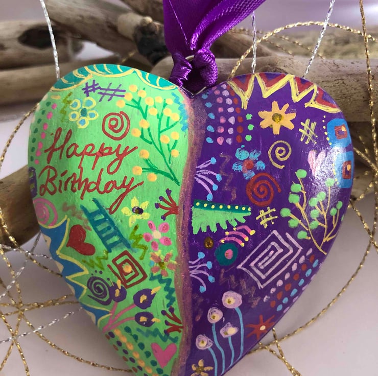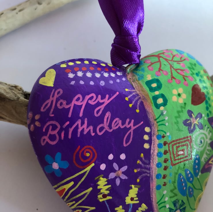 Happy birthday hand painted wooden heart