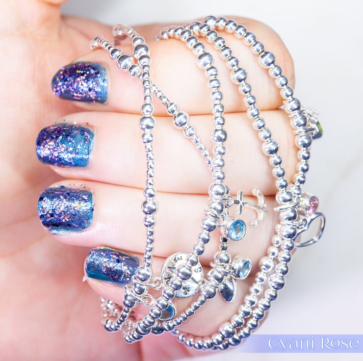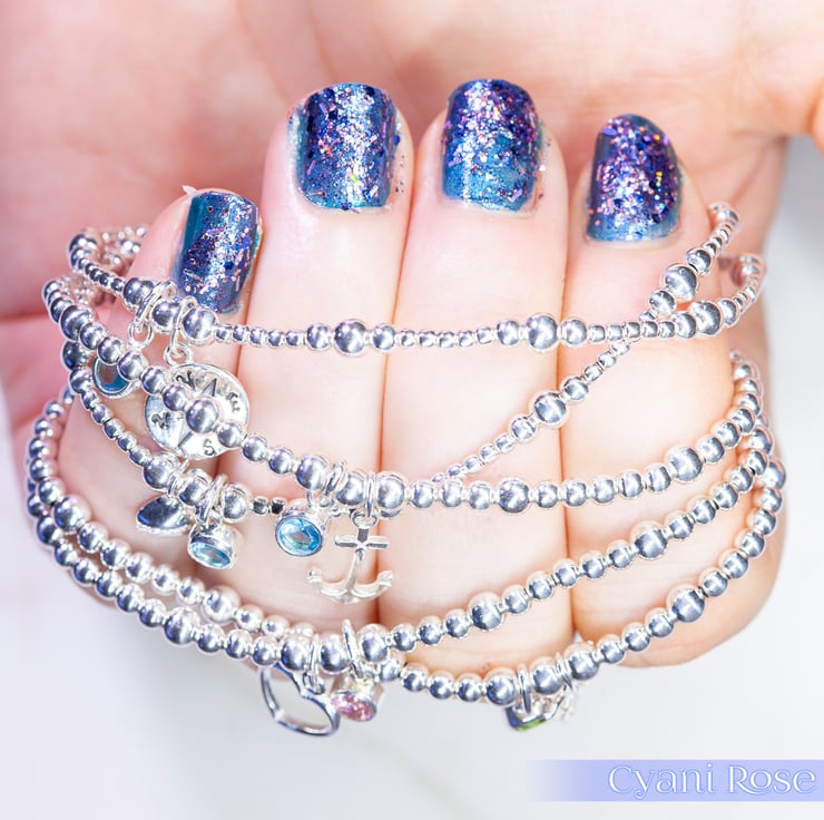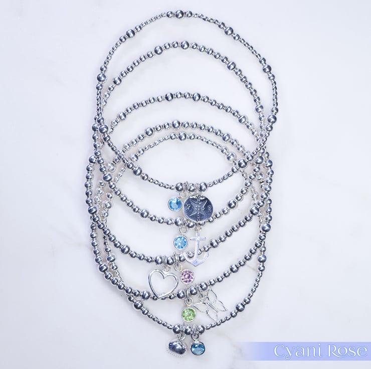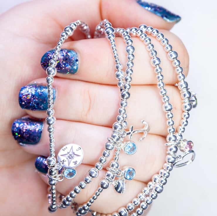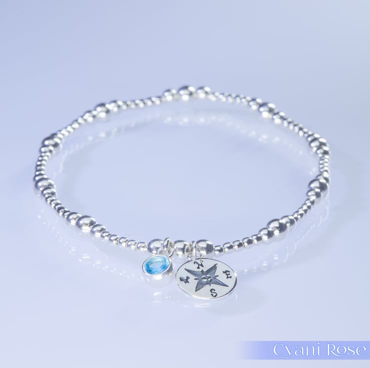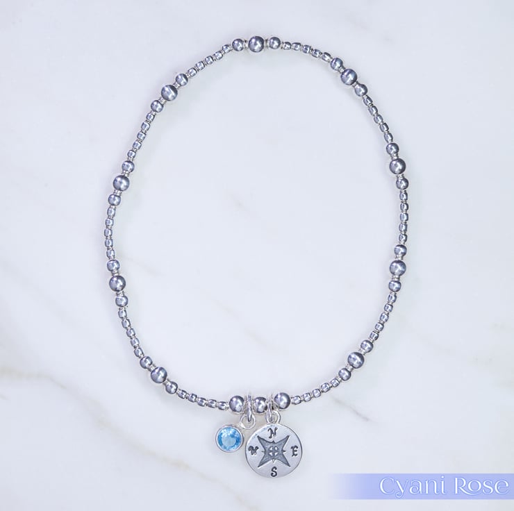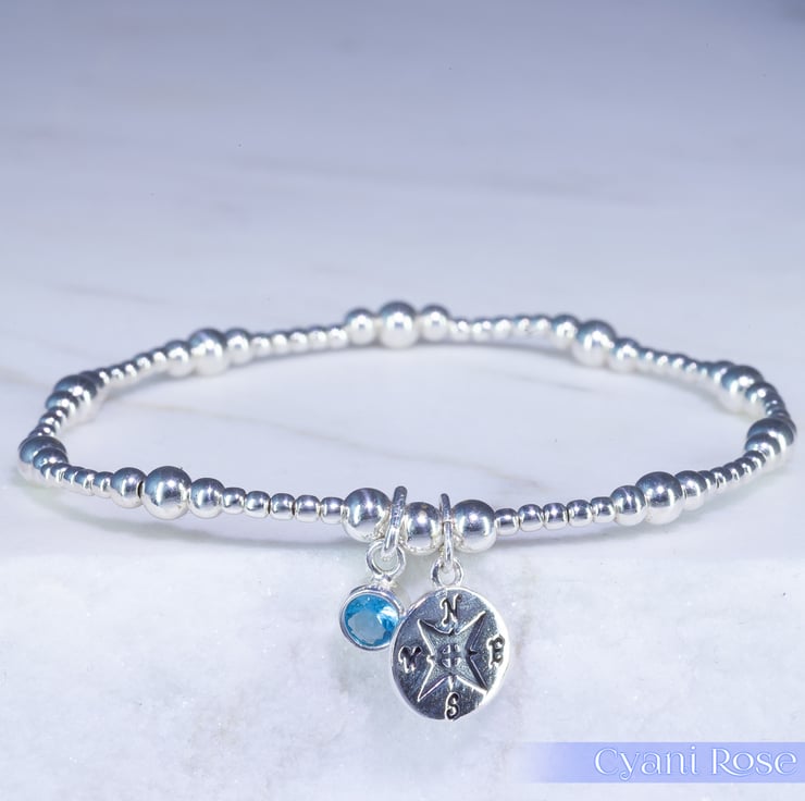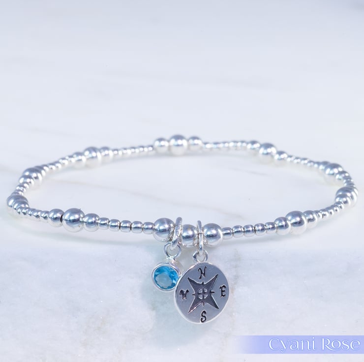 We have made this bracelet using Sterling Silver 2,3 and 4mm beads, sterling silver compass charm (approx 1.5cm) and Sterling Silver and Czech Glass charm (approx 1cm).