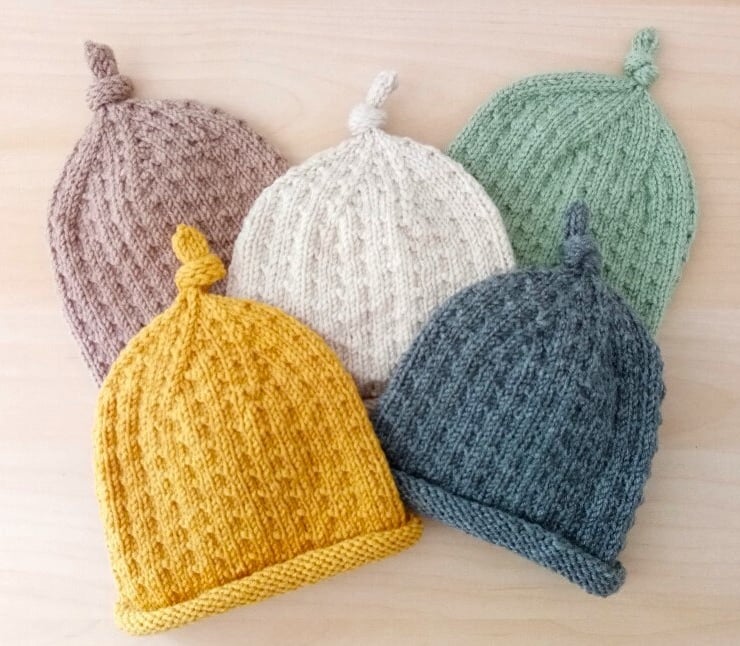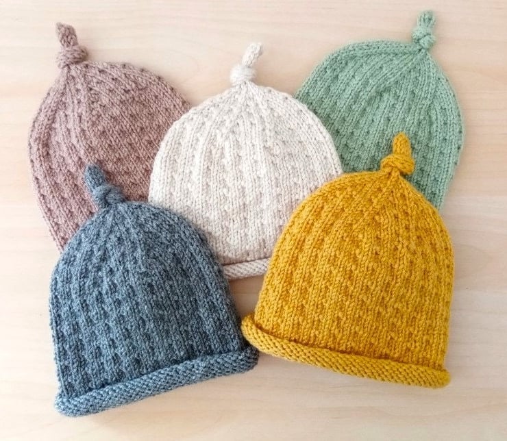 My cosy baby hats are hand knitted in quality, super-soft, 100% acrylic, baby yarn. They are knitted in one piece for a stretchy and comfortable fit and can simply be rolled up or down as your baby grows. A perfect gift for a baby shower and as a keepsake.