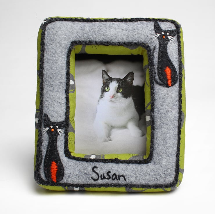 I have appliquéd two little black cats into the frame and if you would like I can embroider a name or message onto the frame - see final photo as an example.