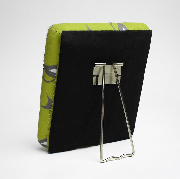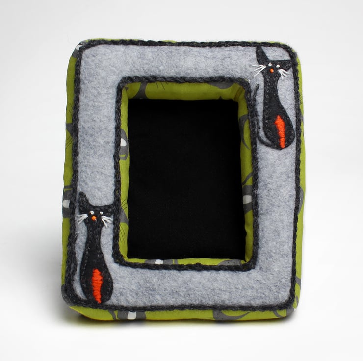 The photo frame is made from grey wool felt on the front and my own green mid-century cat print on the sides. The outer edge of the frame measures 5.5 inch(14cm) by 6.5 inch(17cm) and is suitable for a 4 inch(10.5cm) by 3 inch(7.6cm) picture/photo. The frame is three dimensional - stuffed - and stands on its own with a metal pedestal. The back has a black felt panel which holds your photo in, you simply slide it in carefully under the black panel. There is no glass in the frame but you can always laminate your photo for protection. The frame is trimmed with two rows of crochet around the outer and inner edge of the front in charcoal grey wool.