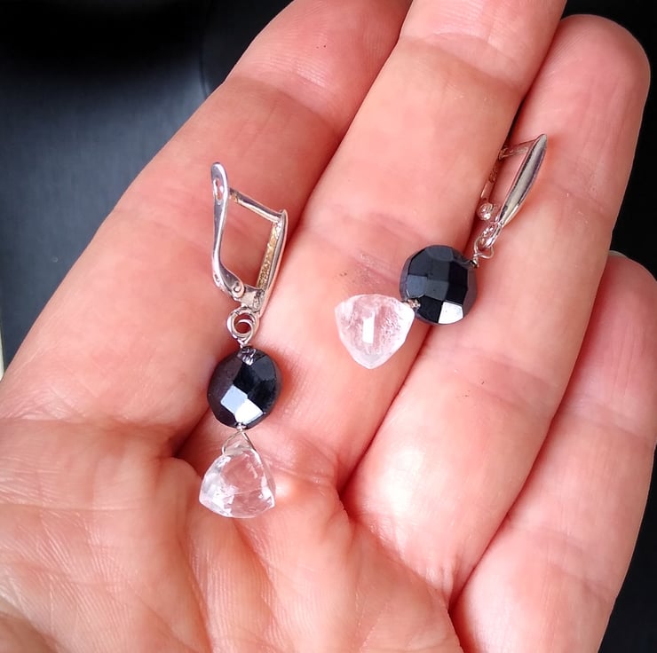 All eyes on you as you enter the room wearing these beautiful faceted black spinel and clear quartz gemstone 925 sterling silver earrings. A classic pair of monochrome gemstone crystal earrings suitable for any occasion and any age. Finished with a secure latch back sterling silver ear fitting.