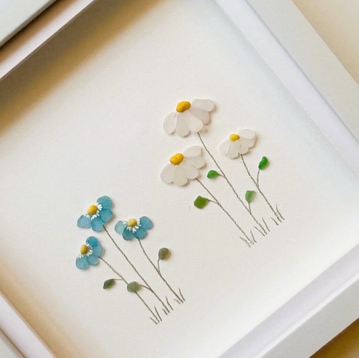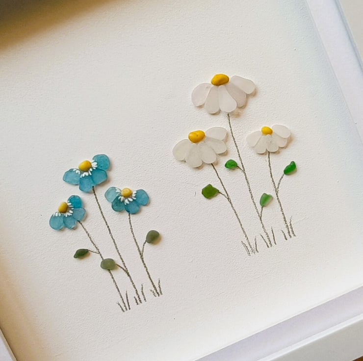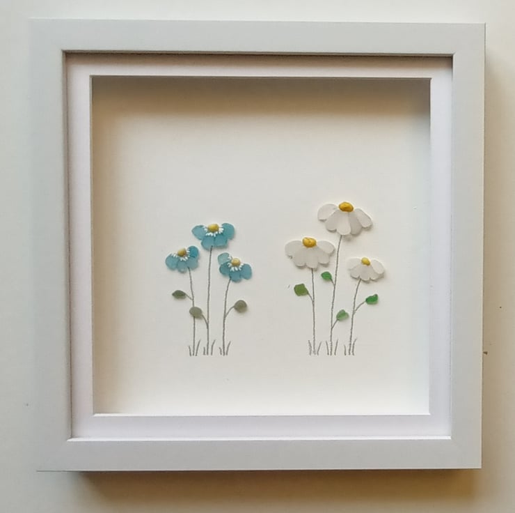 Forget me nots and daisies made with little nuggets of beachcombed Cornish sea glass set inside a 29cm square glazed box frame that is available in white.