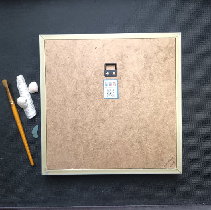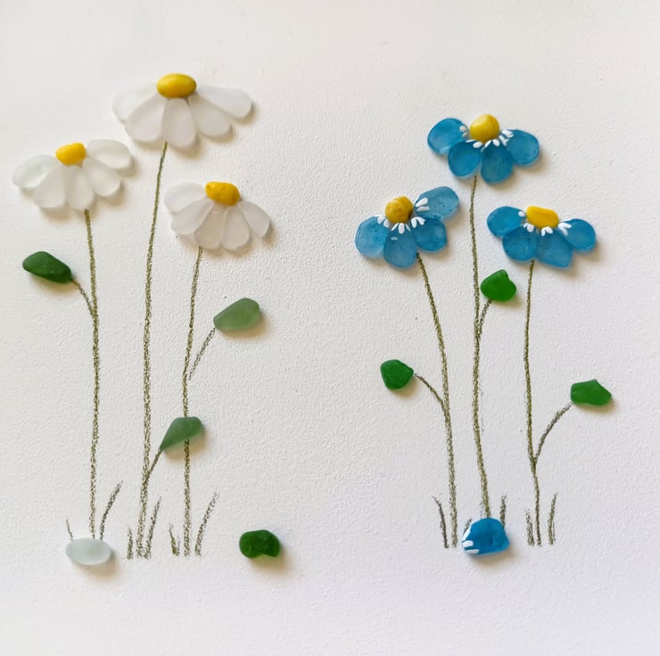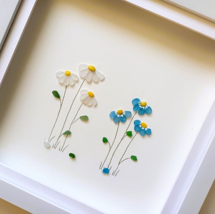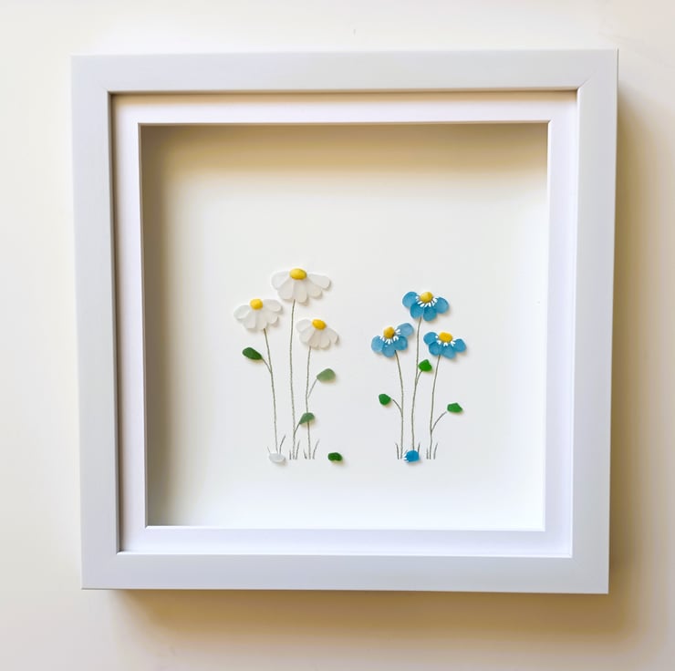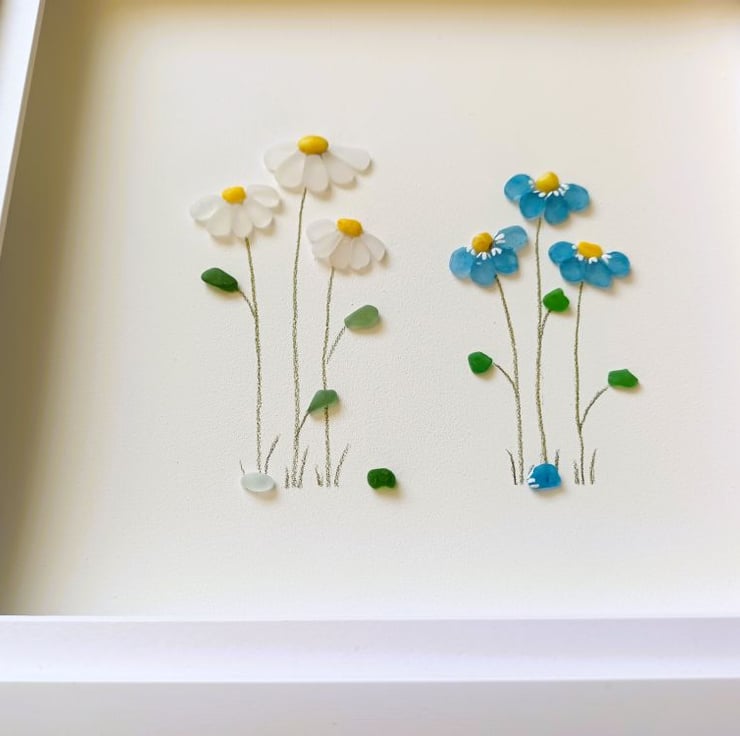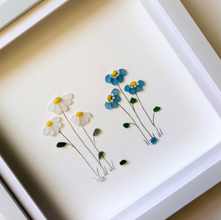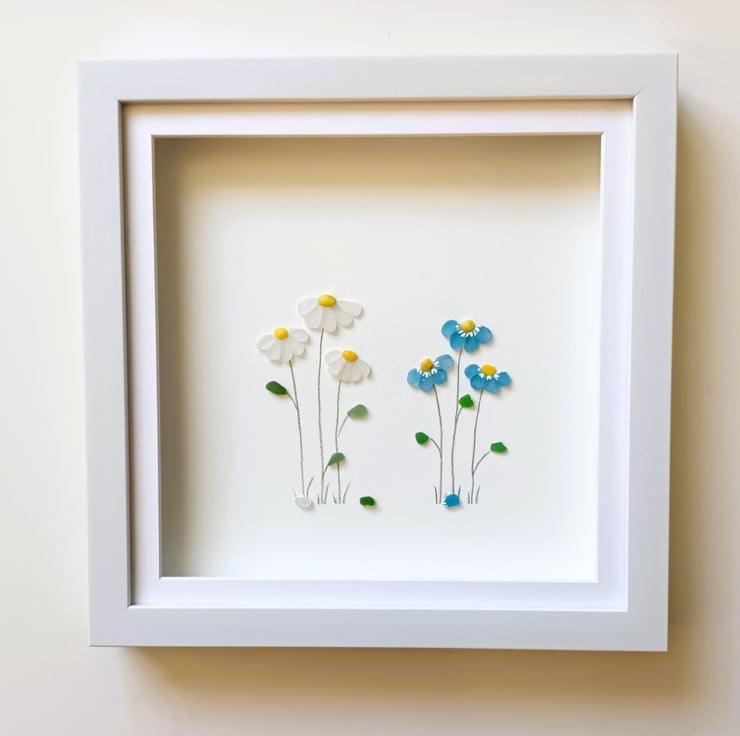 Forget me nots and daisies made with little nuggets of beachcombed Cornish sea glass set inside a 29cm square glazed box frame that is available in white.