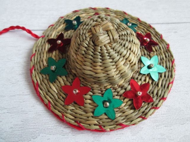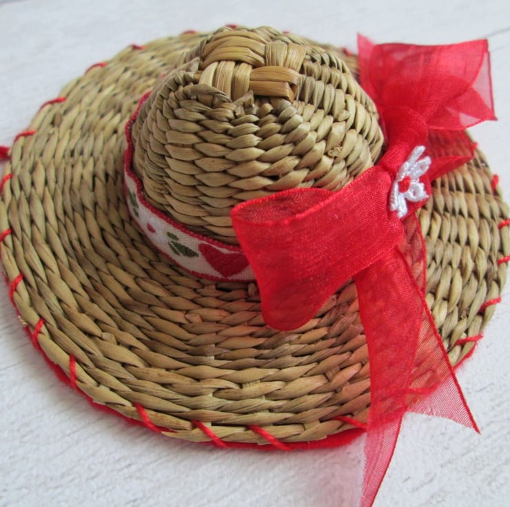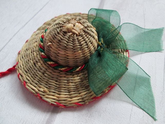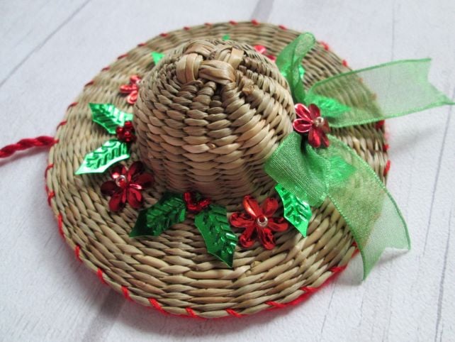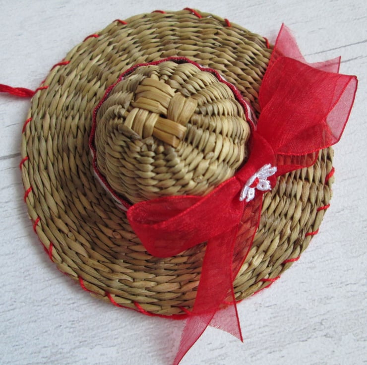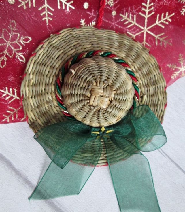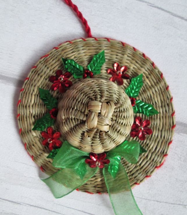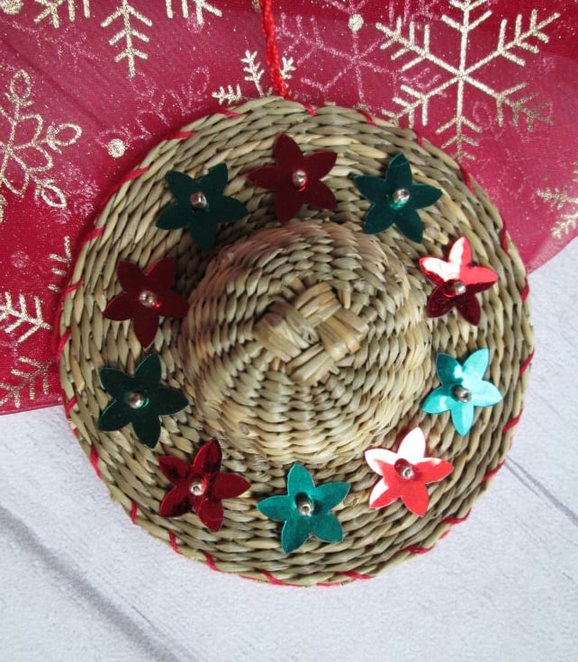 Something a little bit different - a set of four miniature straw hats, each 10cm in diameter, individually decorated with festive ribbon, braid, beads and sequins. A nod to my Luton hat-making heritage, each little hat is finished with a felt back and a twisted hanging loop ready to hang on the tree.