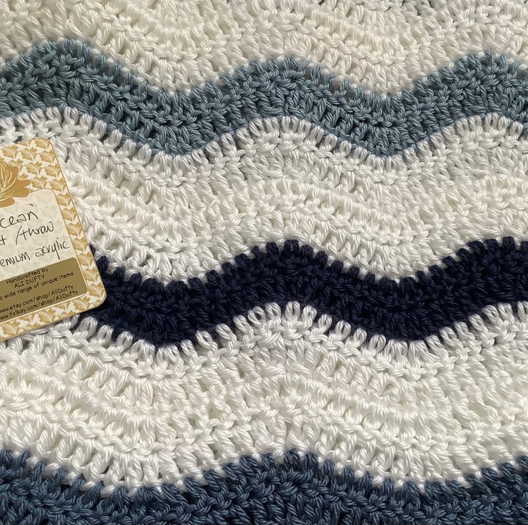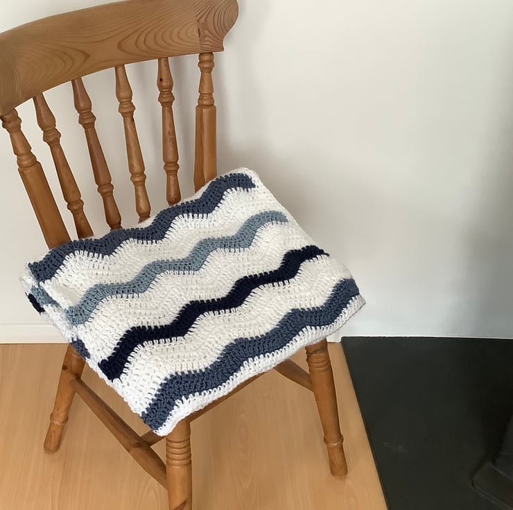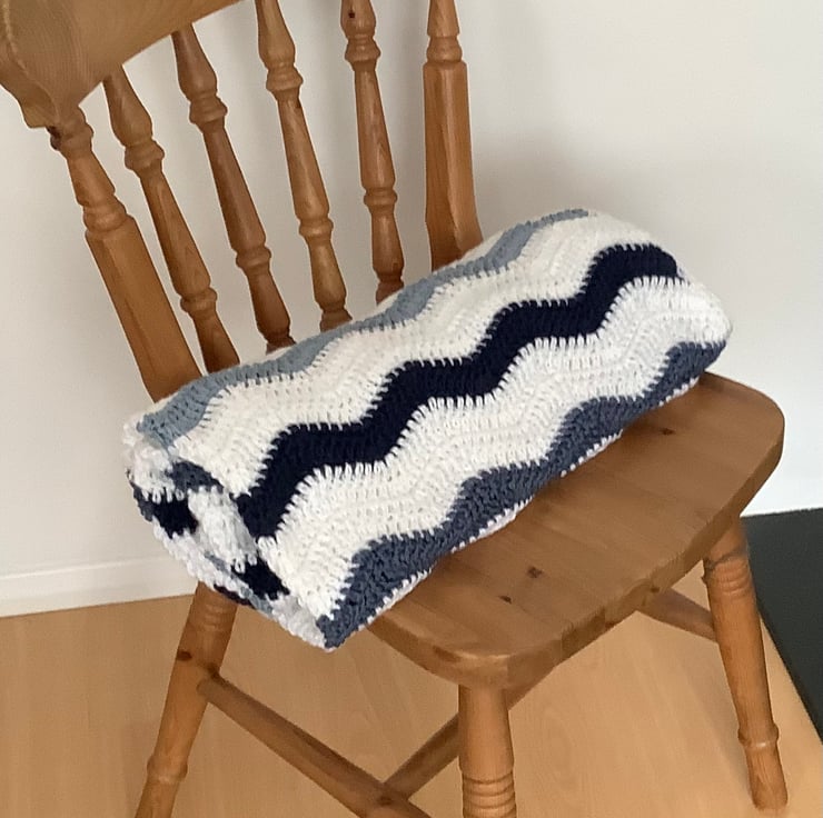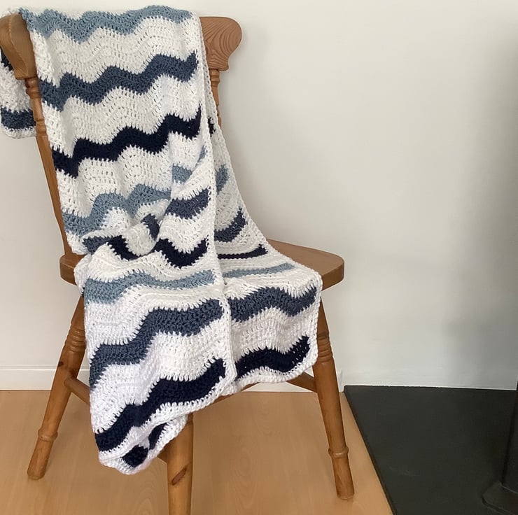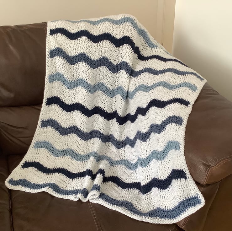 I have designed and crocheted this blanket / throw ' Ocean ' , in a fresh , nautical colour scheme . Worked in a ripple pattern of blues and white. I've used a premium grade ( super-soft !), easy care acrylic yarn . Medium weight for year-round use.