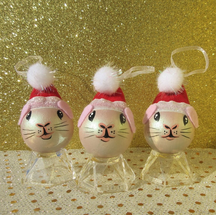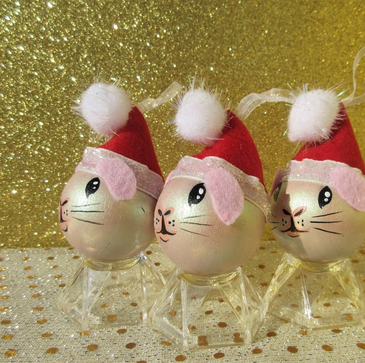 Each guinea pig is wearing a mini Santa hat, made by myself, which has a loop of ribbon for hanging it by.