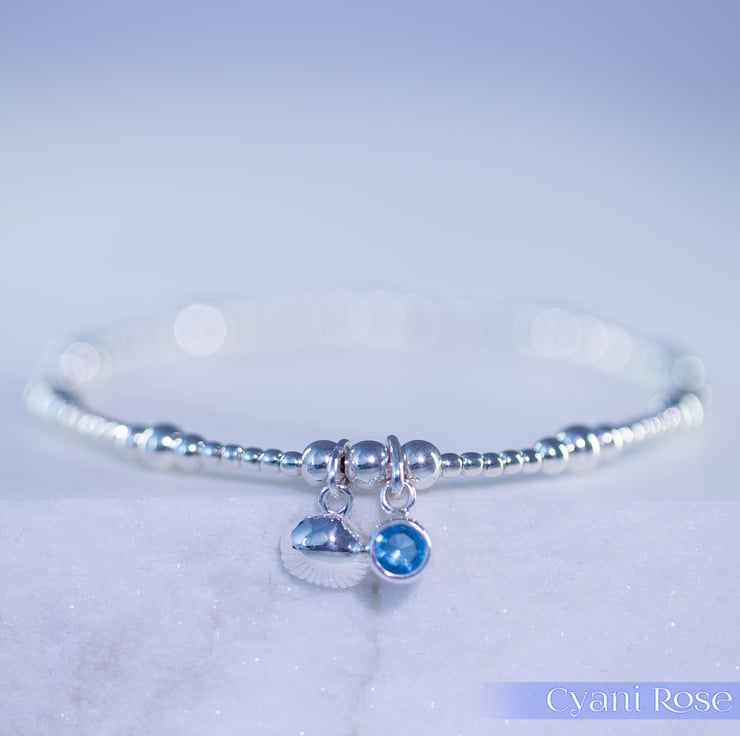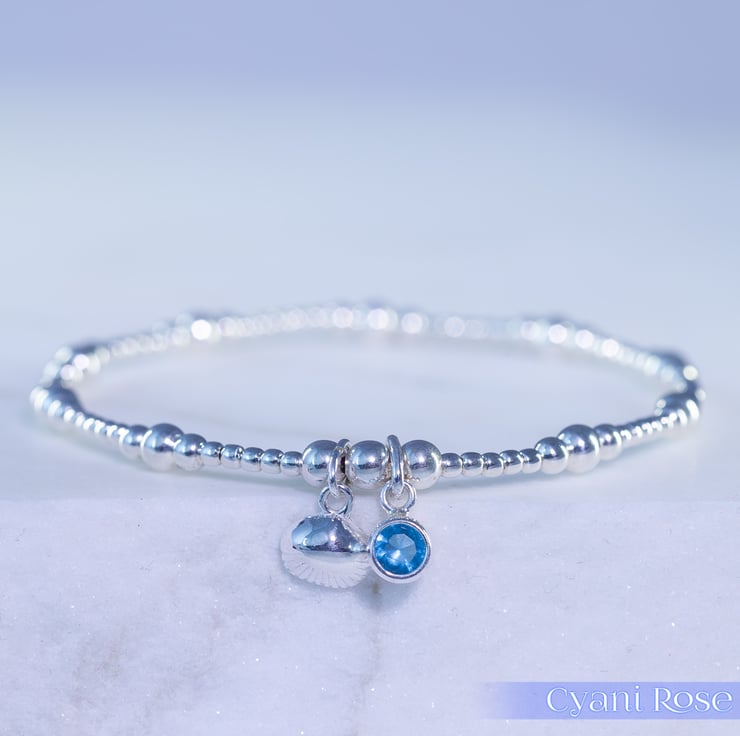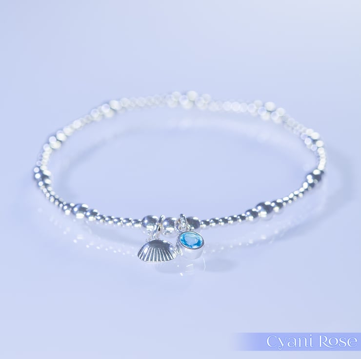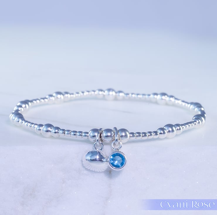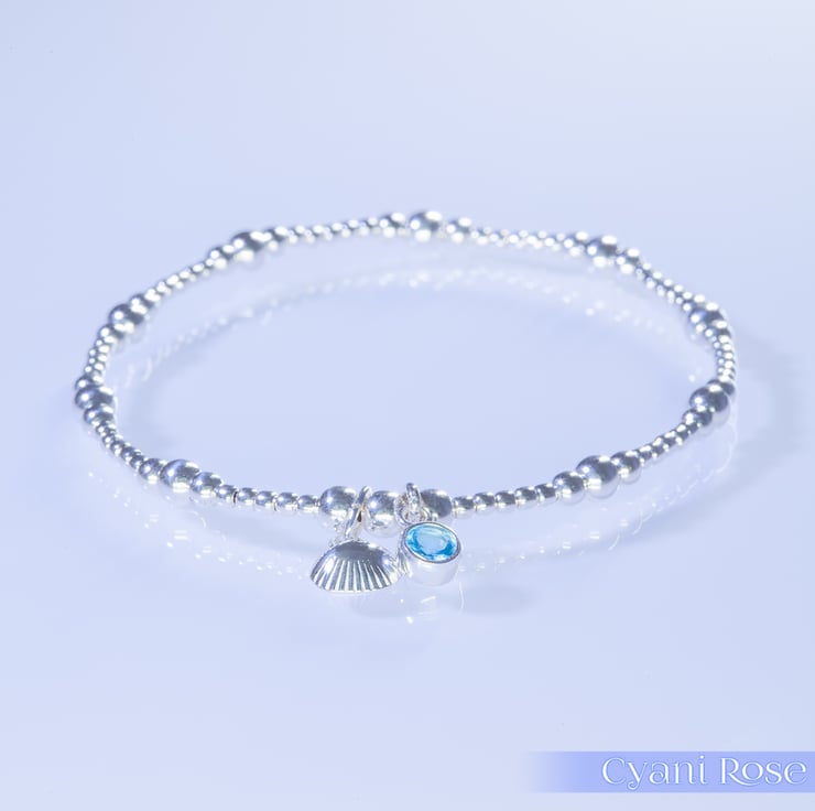 We have made this bracelet using Sterling Silver 2,3 and 4mm beads, sterling silver shell charm (approx 1 cm) and Sterling Silver and Czech Glass charm (approx 1cm).