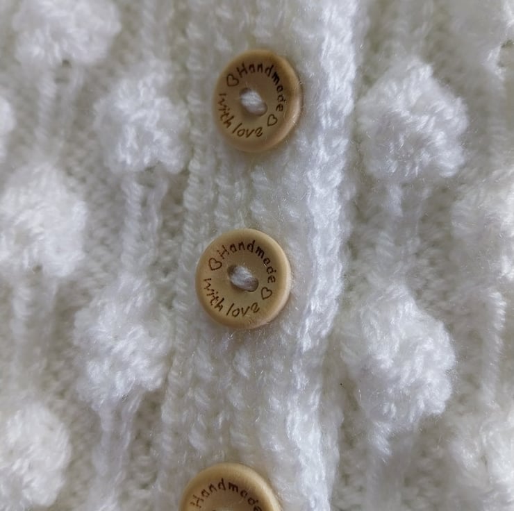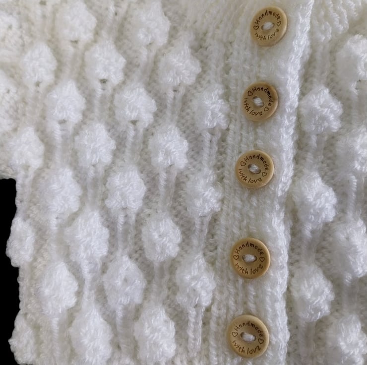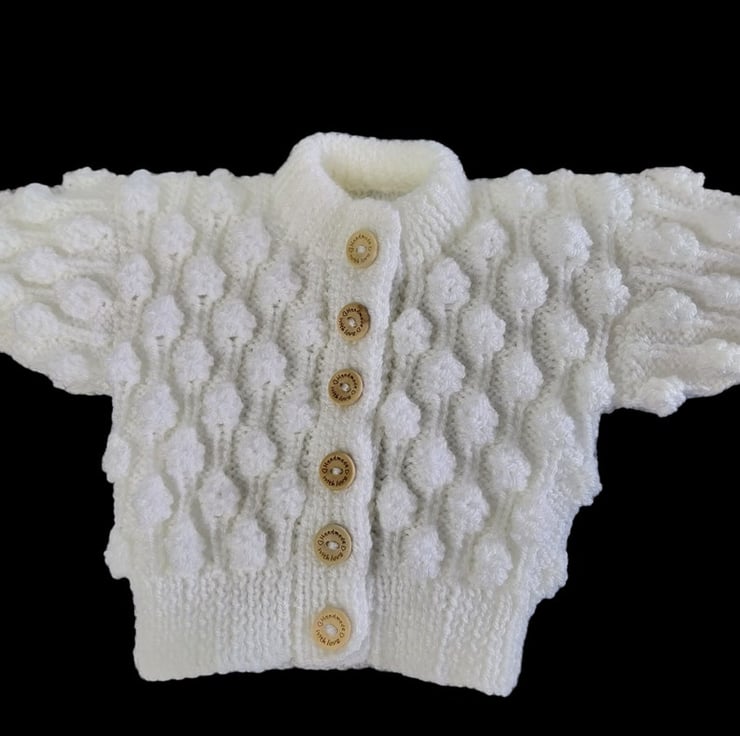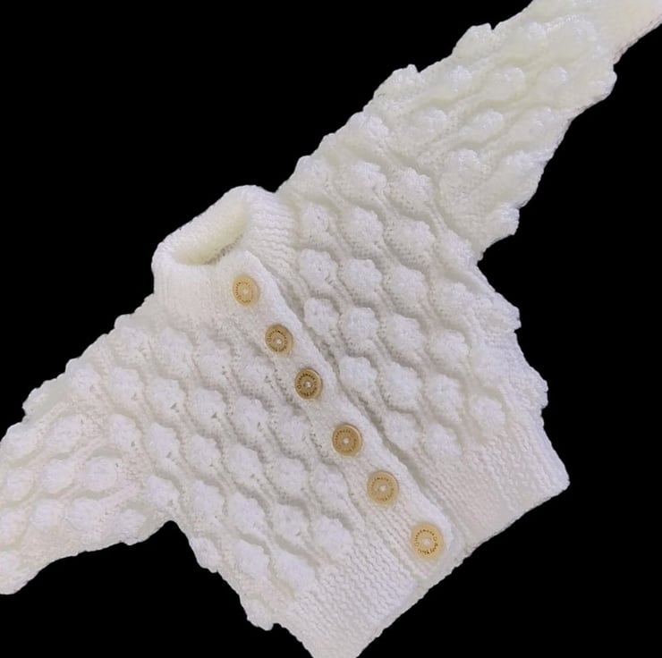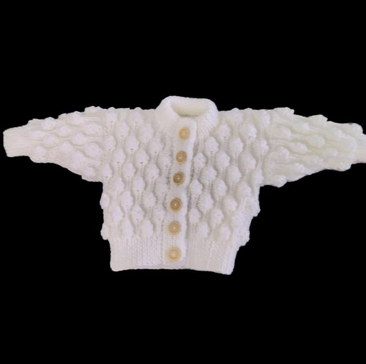 Hand-knitted Baby Cardigan in a pristine white shade. This charming cardigan boasts an intricate textured bobble pattern all over, enhancing its design with a delightful touch.