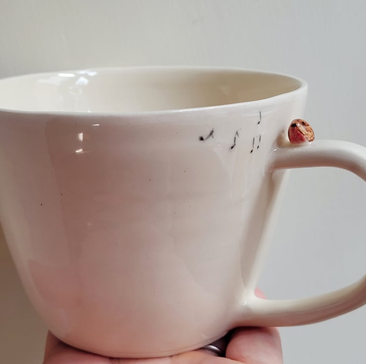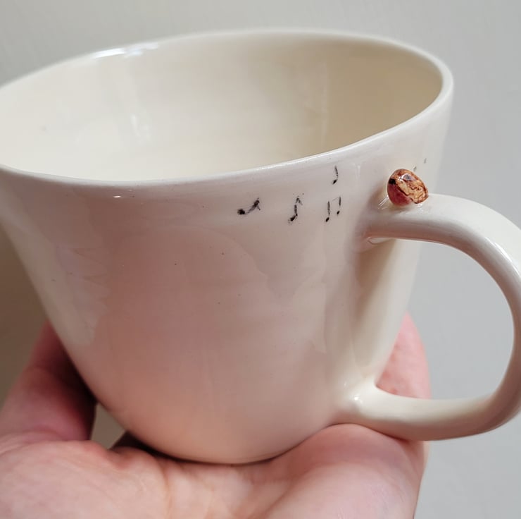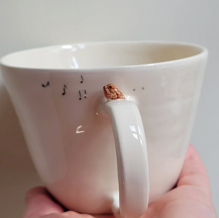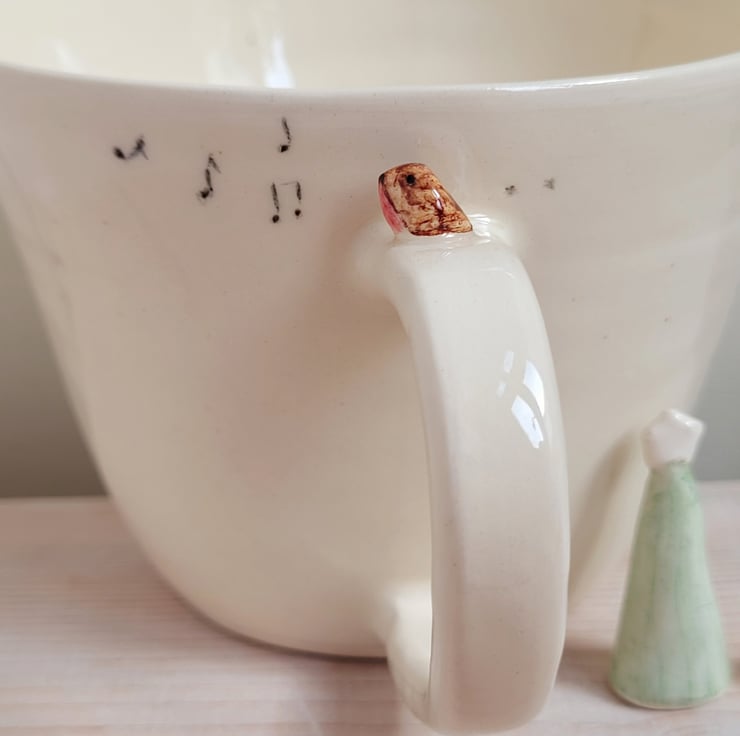 Handmade ceramic robin cup with bird prints and musical notes Pottery gift idea