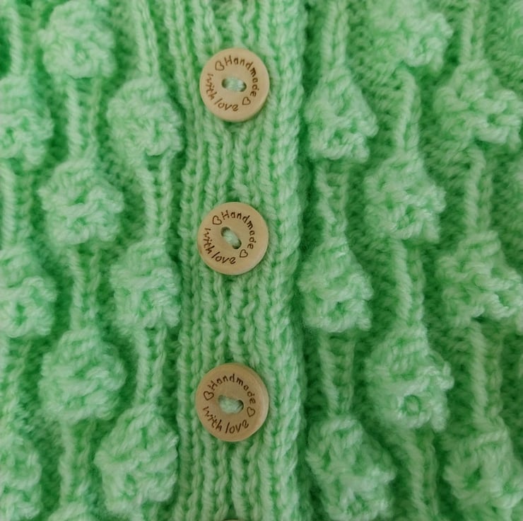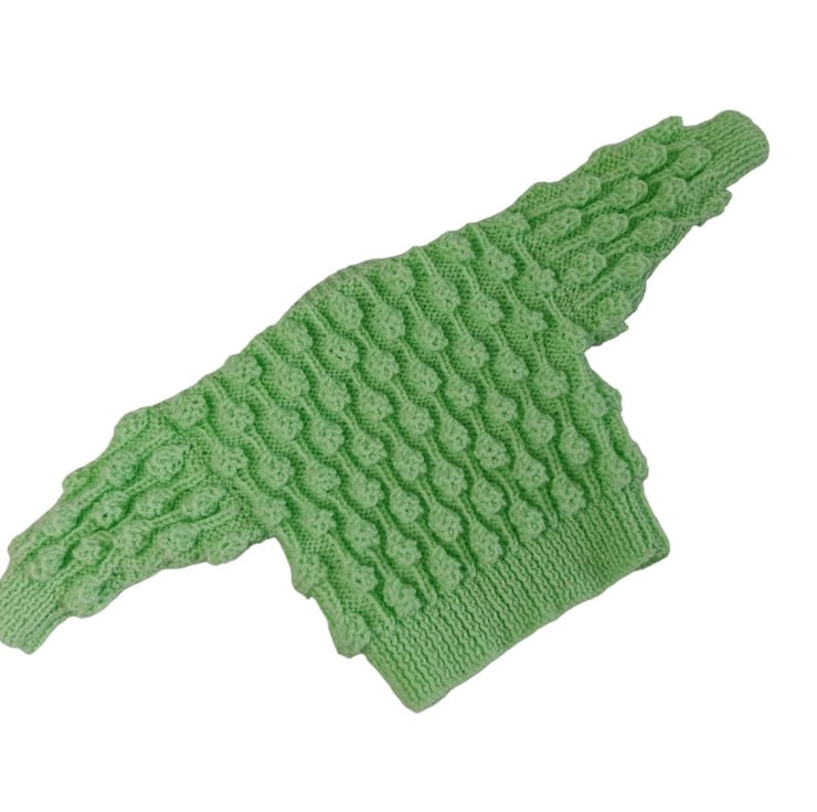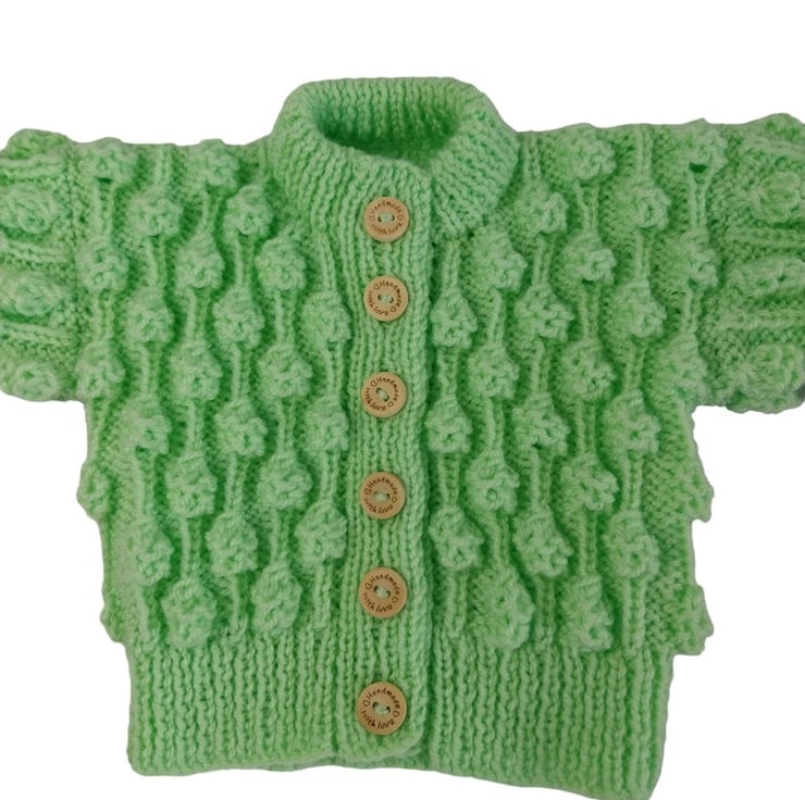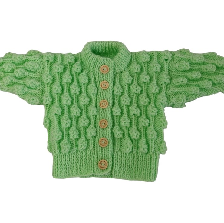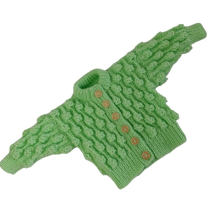 Hand-knitted Baby Cardigan in the invigorating hue of Spring Green. This charming cardigan features an enchanting all-over textured bobble pattern, adding a delightful touch to its design.