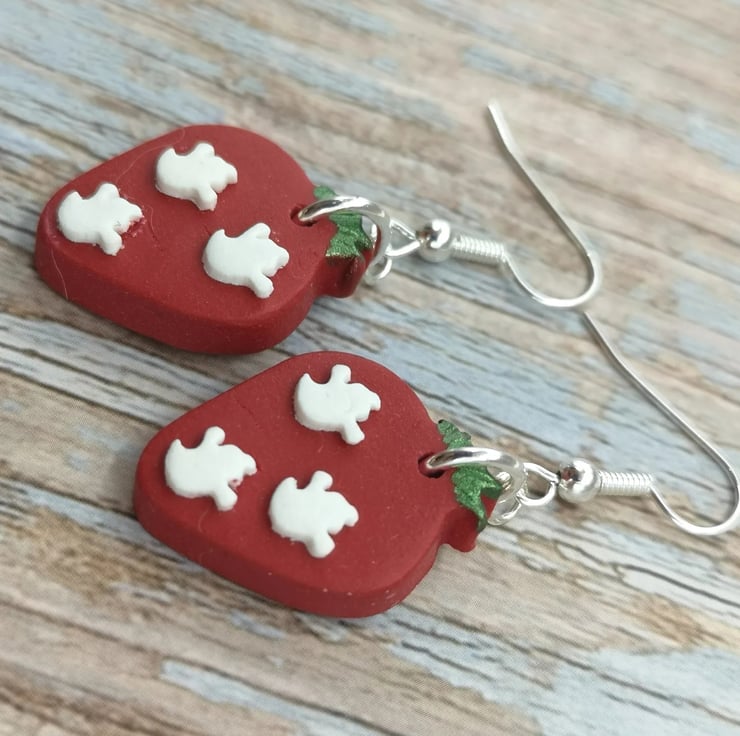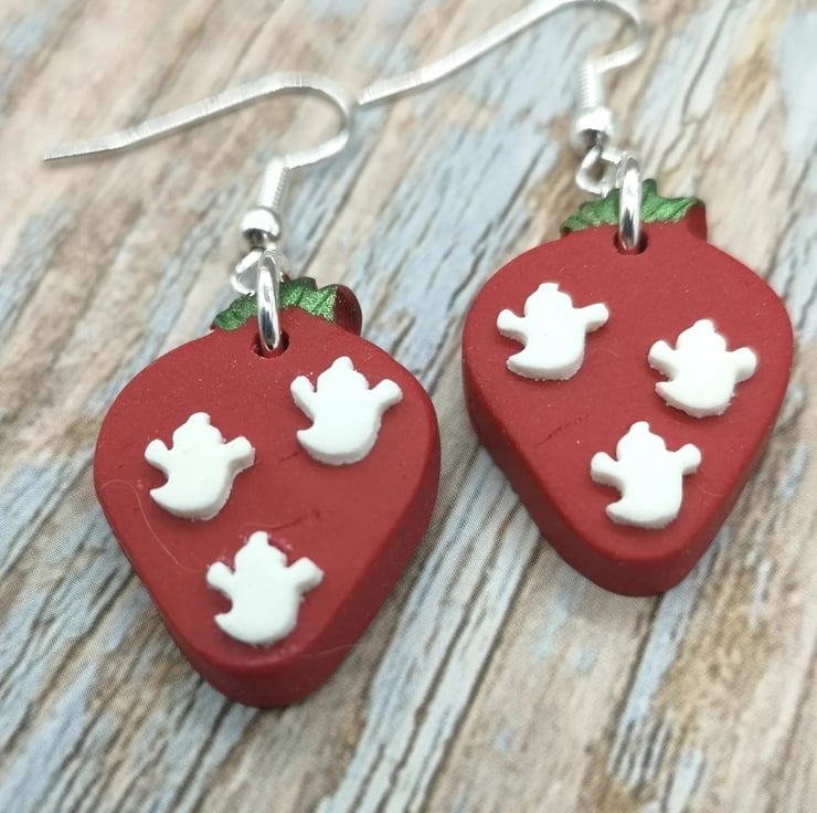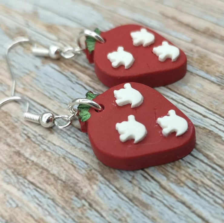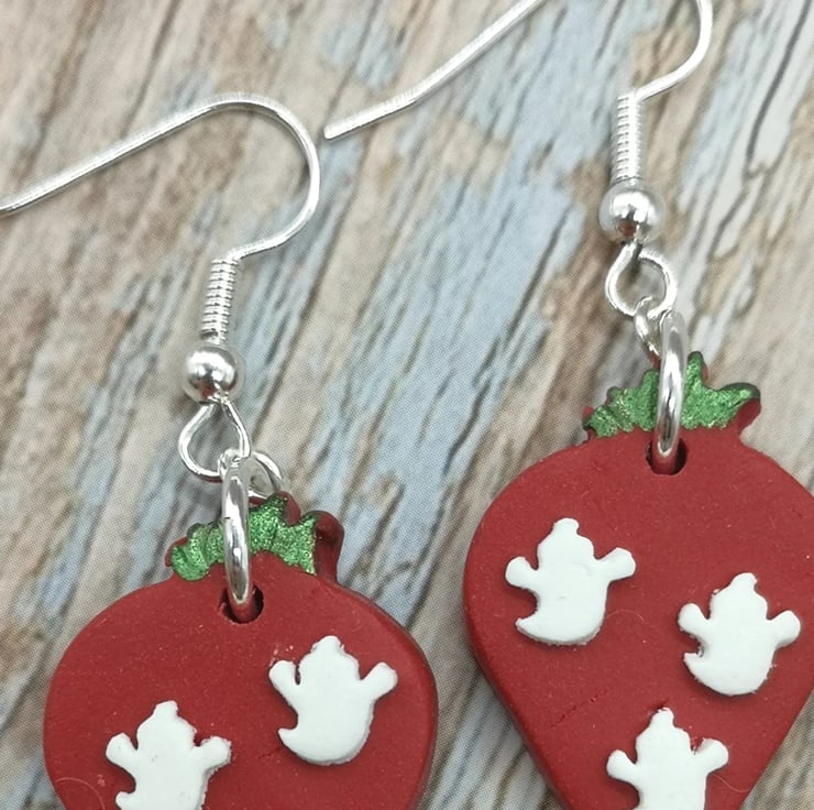 Sterling silver plated ear wires. Strawberry is approximately 23mm tall and 4mm thick. Polymer clay brand is souffle clay,