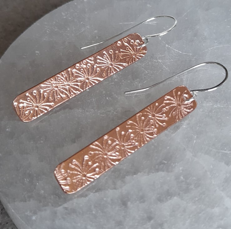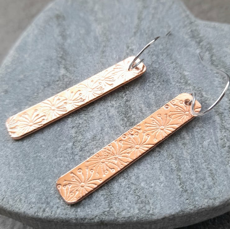 Copper which has been stamped with a pattern of a dandelion, the copper bars have then been attached to sterling silver handmade ear wires