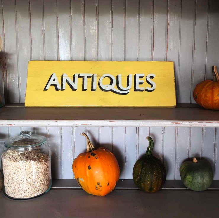 Hand-Painted vintage-style "ANTIQUES" wooden sign on reclaimed timber.