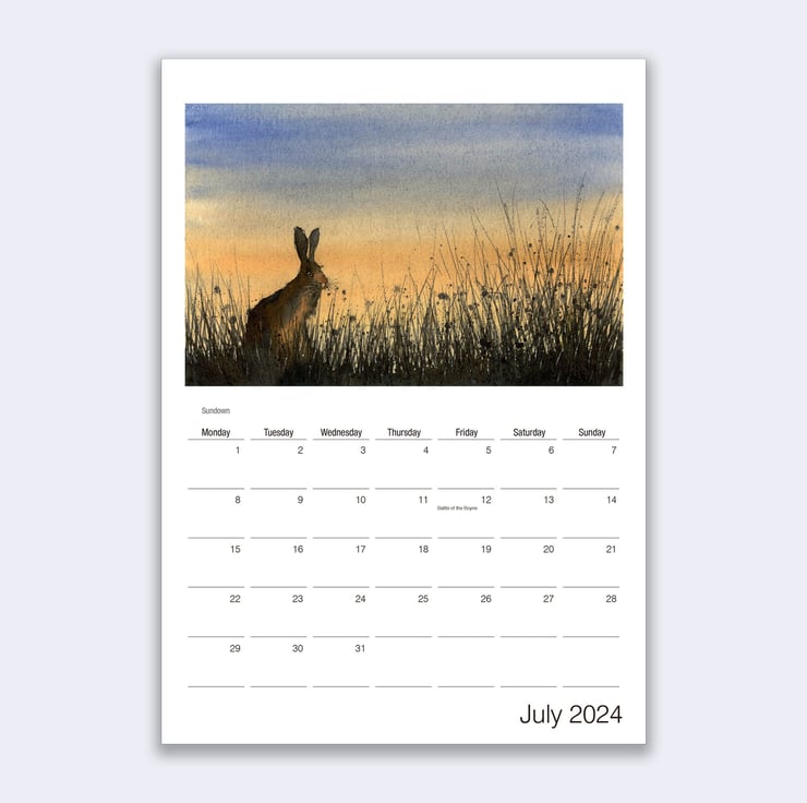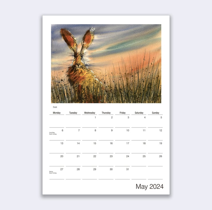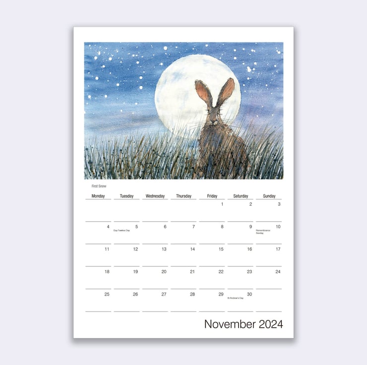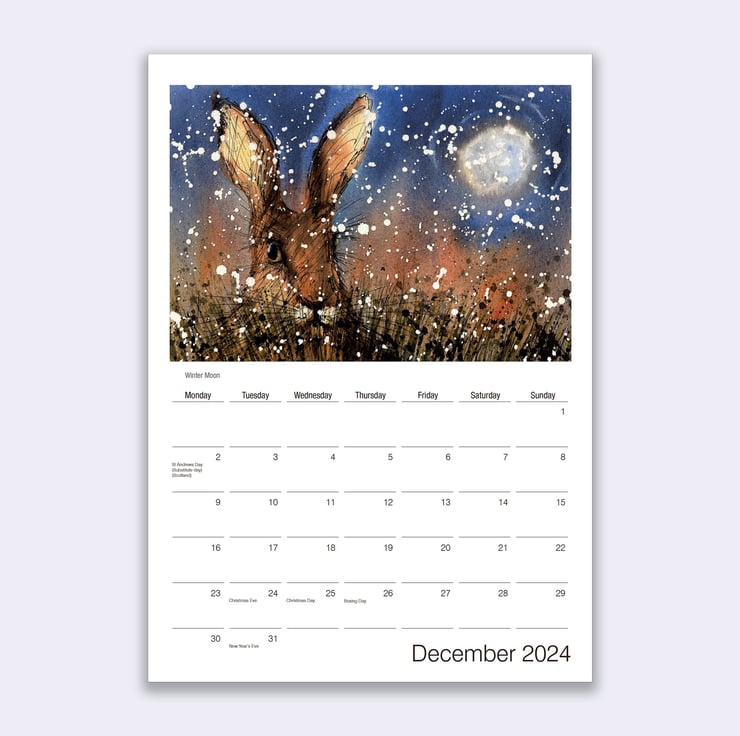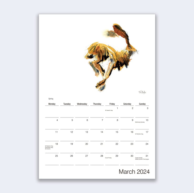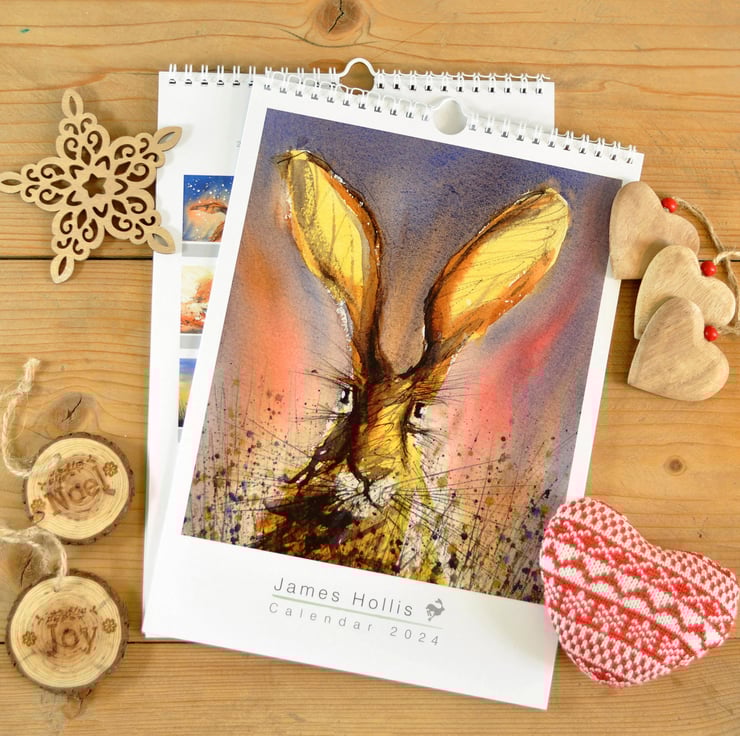 A stunning wall calendar for 2024 featuring a beautiful hare artwork by James Hollis for each month of the year.