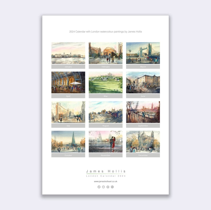 A stunning calendar, with watercolour paintings of London with a different painting for each month of the year. Artworks by James Hollis