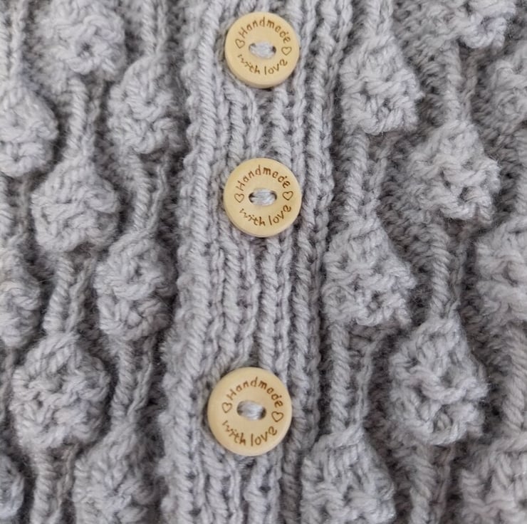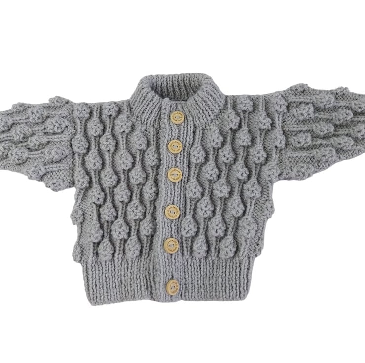 Hand-knitted Baby Cardigan in a charming Silver Grey hue. This adorable cardigan boasts an all-over textured bobble pattern, adding character and charm to its design.