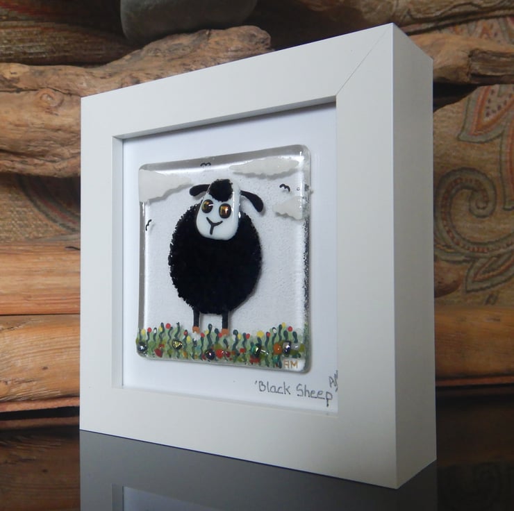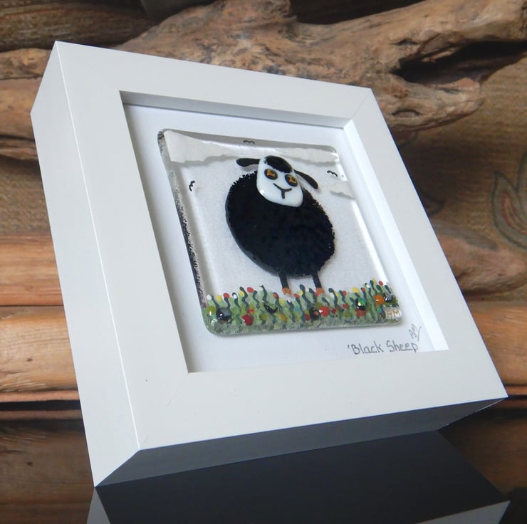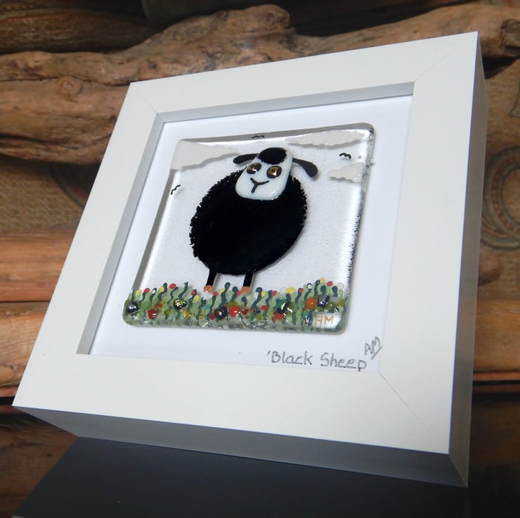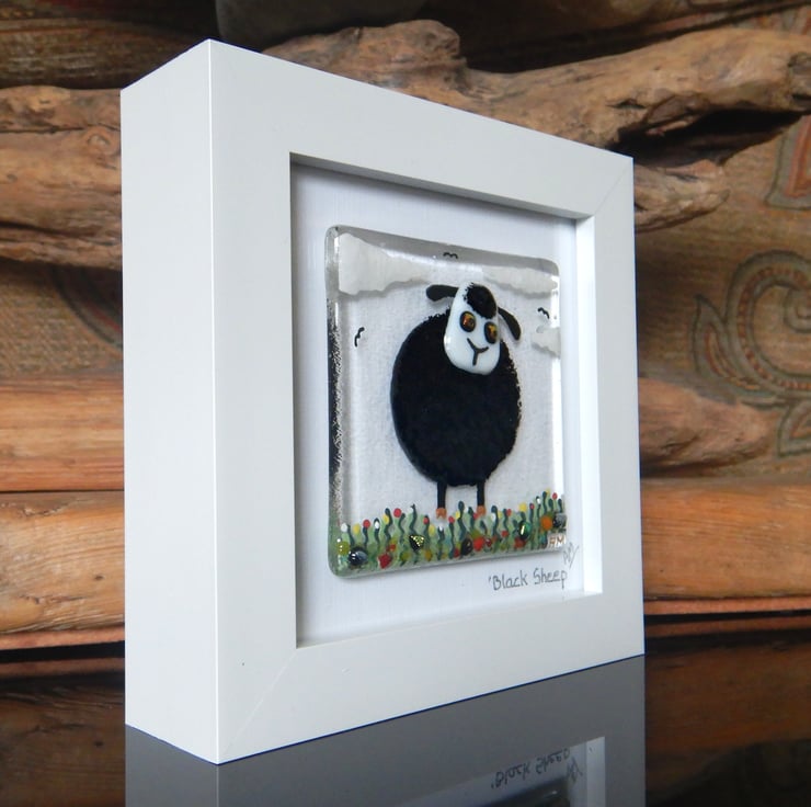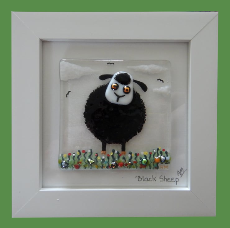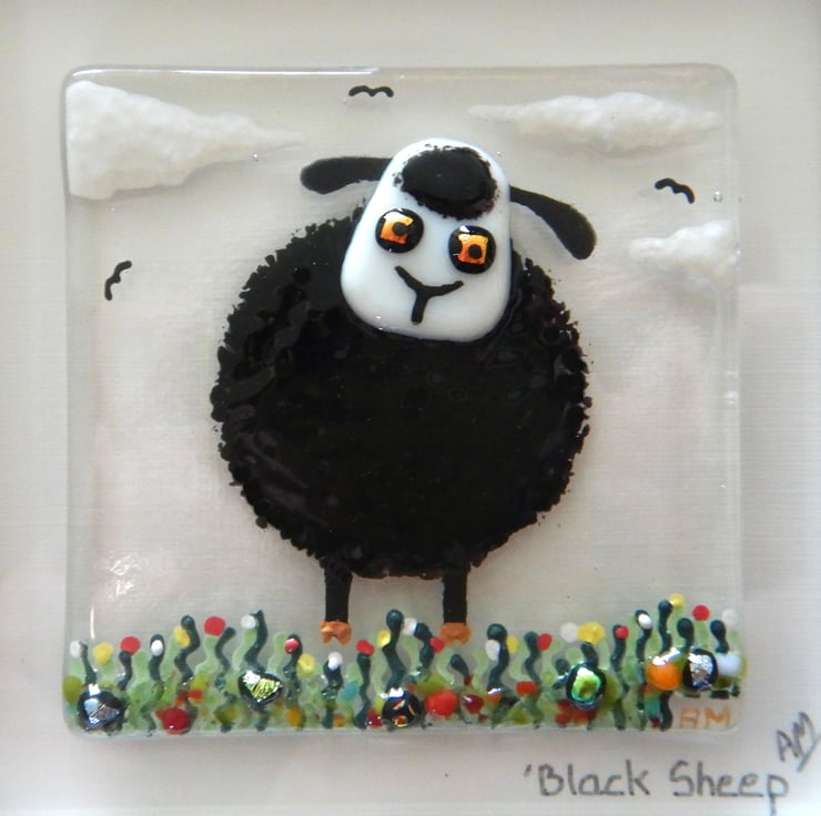 'Black Sheep' is made completely from glass which has been fused in my kiln. There is no enamel, glass paint or any other materials used, this picture is 100% pure bullseye fusing glass!